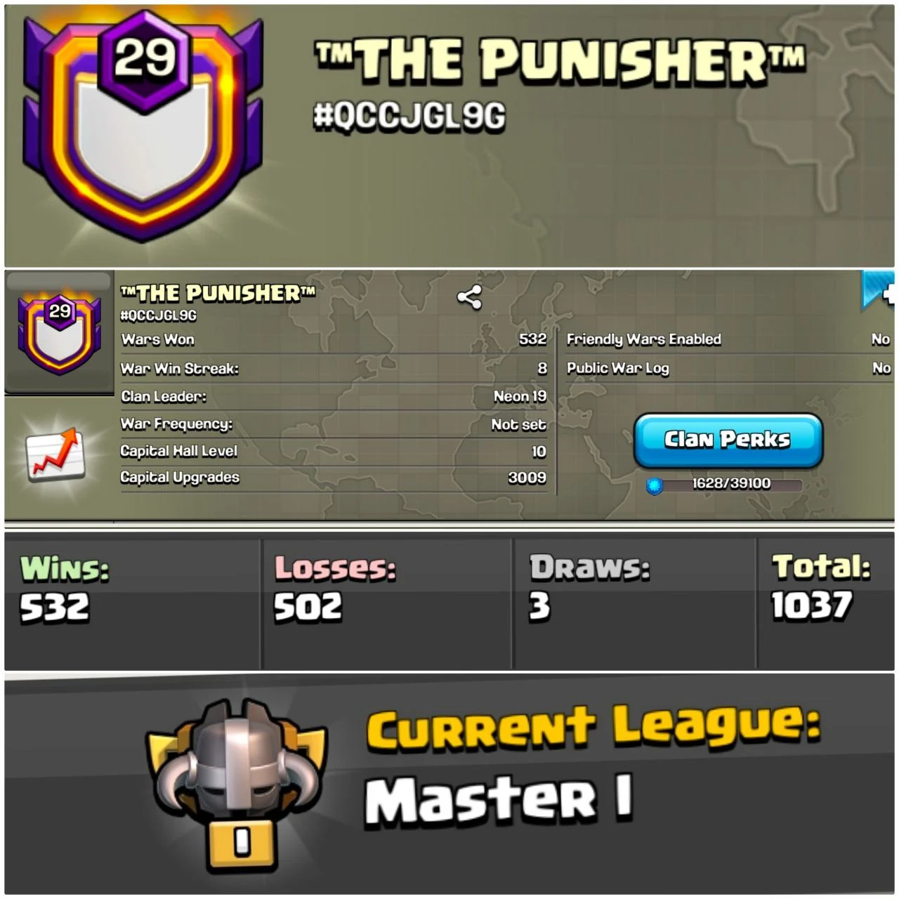 Level 29 | Name- THE PUNISHER | Clan Capital 10 | Master League | Awesome Warlog| Fast Delivery