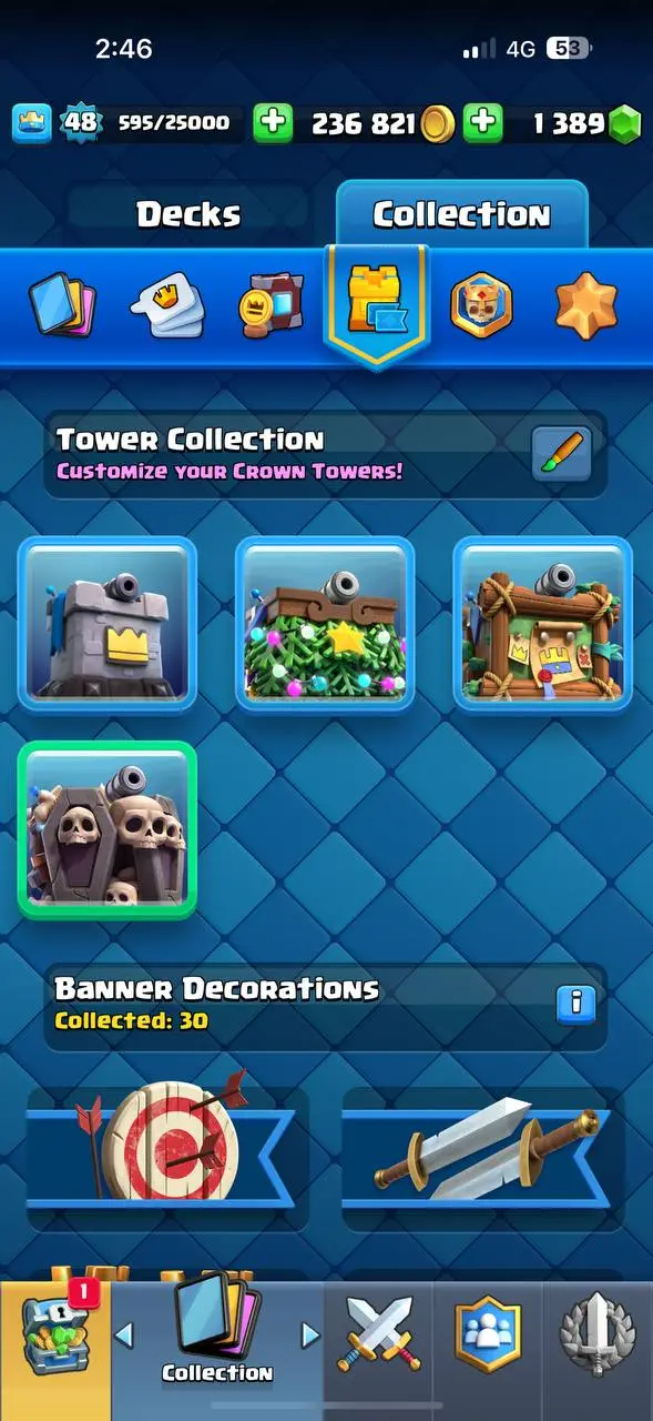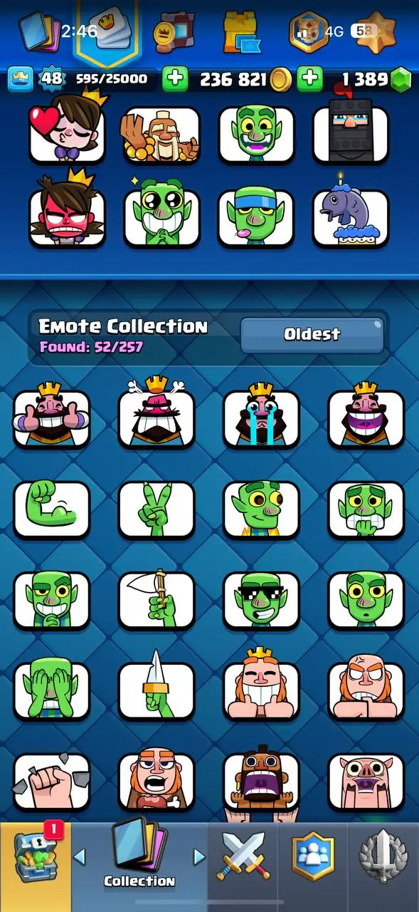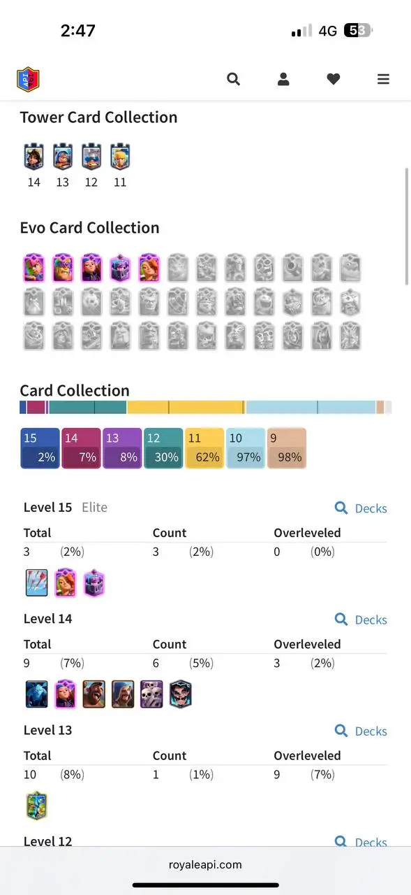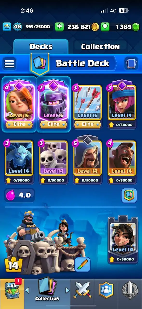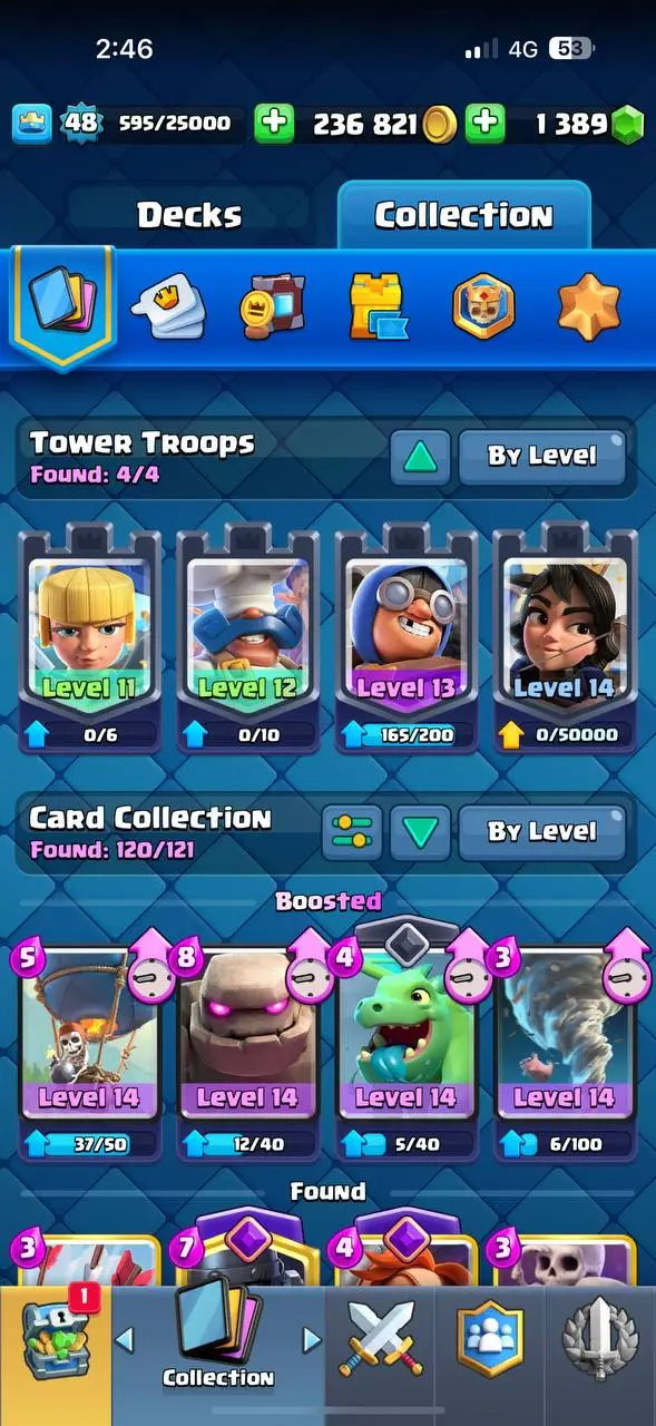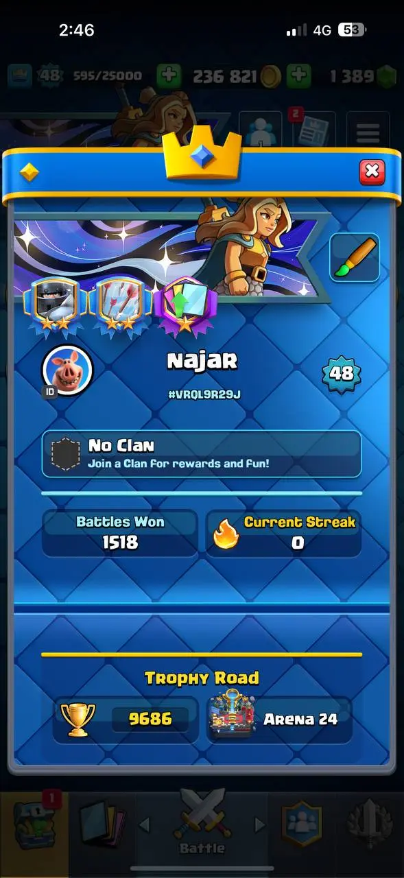 0p 💥 9 MAX CARDS 🔹 ARENA 24 ⚔️ 3 ELITES 🔹 5 EVO 🏆 9686 TROPHIES 📈 XP48 🏰 KT14 💎 1389 GEMS 😀 52 EMOTES ⚡️ INSTANT