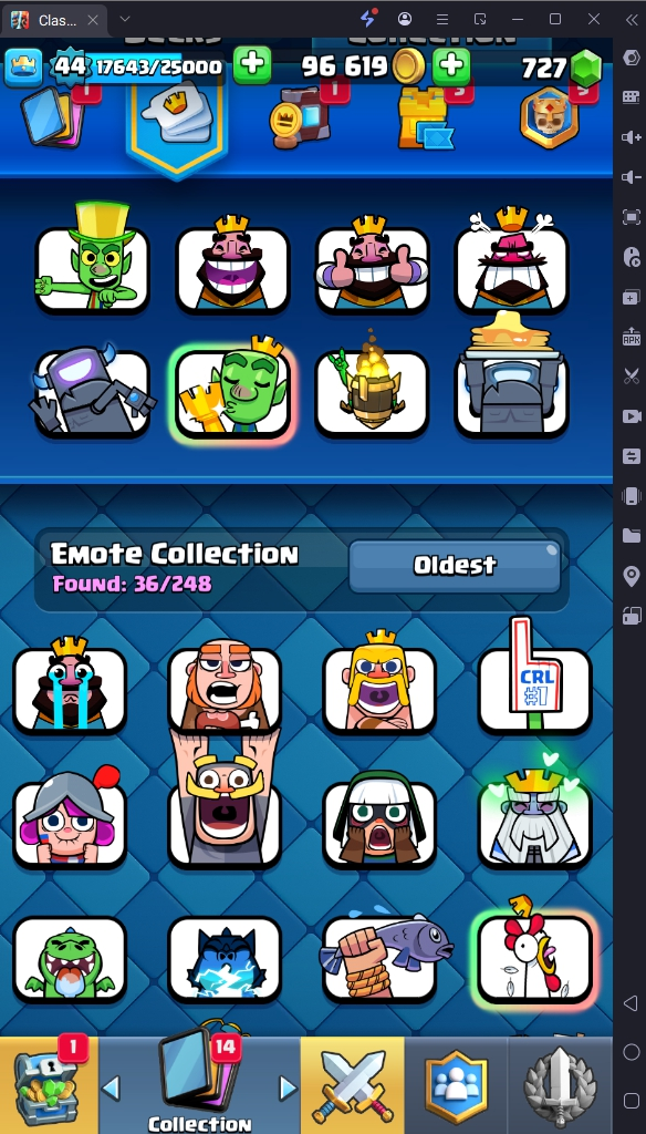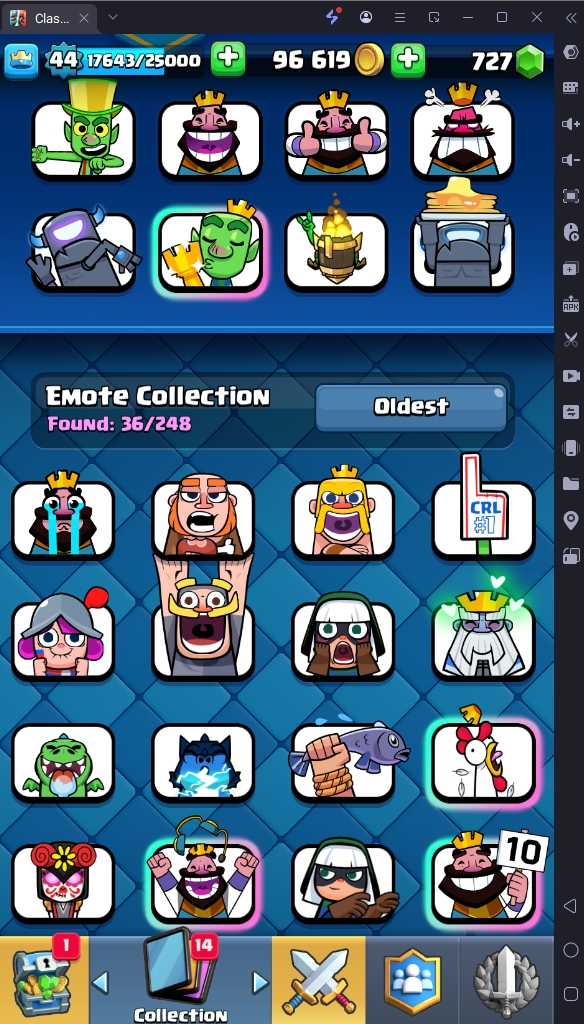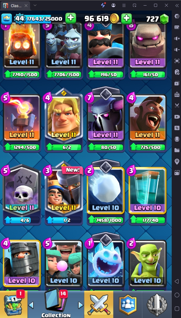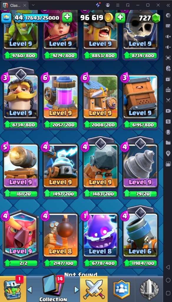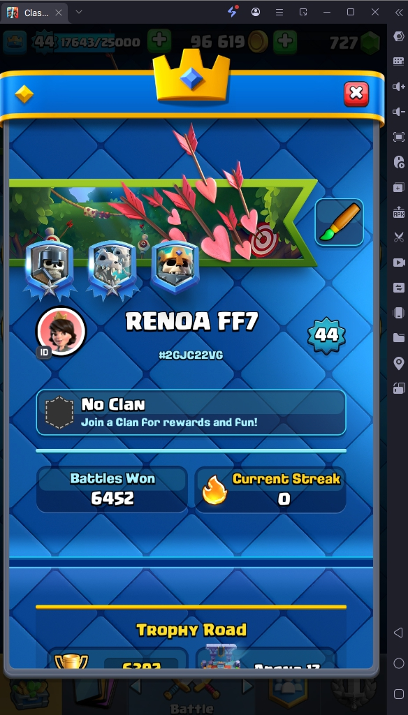 6392 TROPHY 🏆 GOBLIN KISS TROPHY EMOTE 🧡 44 LVL 💯 KT 14 👑 108 CARDS ♦️ 15 MAX CARDS 👑 0 ELITE CARDS 🔮 0 EVO 💯 EMOTE 36 🎭 #2GJC22VG ⸱ TAG ACCOUNT ♥️