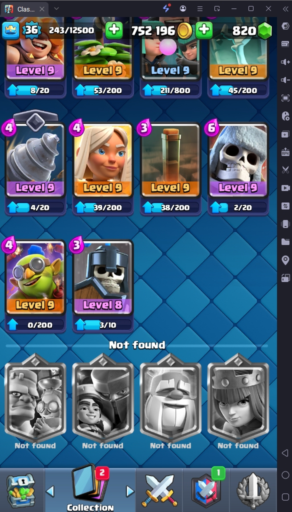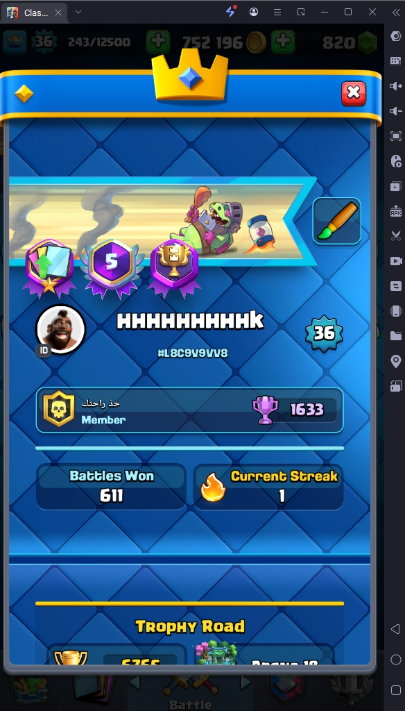 6765 TROPHY 🏆 36 LVL 💯 KT 12 👑 113 CARDS ♦️ 0 MAX CARDS 👑 0 ELITE CARDS 🔮 1 EVO 💯 EMOTE 22 🎭 #L8C9V9VV8 ⸱ TAG ACCOUNT ♥️