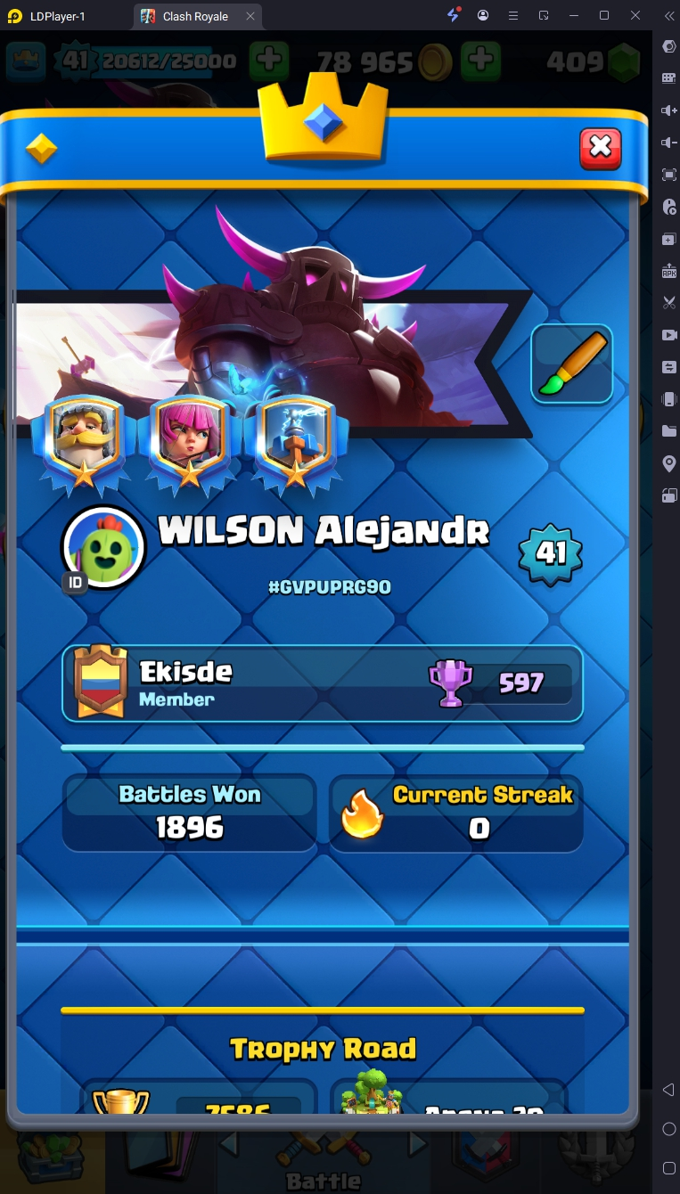 7586 TROPHY 🏆 41 LVL 💯 KT 13 👑 115 CARDS ♦️ 3 MAX CARDS 👑 1 ELITE CARDS 🔮 0 EVO 💯 EMOTE 55 🎭 #GVPUPRG90 ⸱ TAG ACCOUNT ♥️