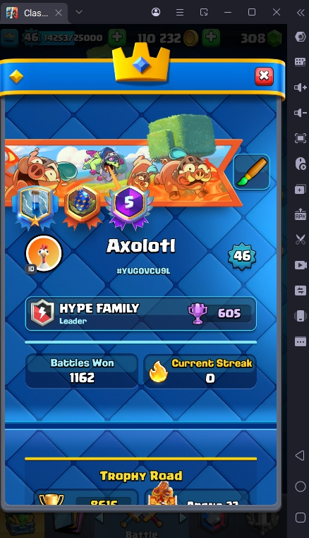 8615 TROPHY 🏆 46 LVL 💯 KT 14 👑 119 CARDS ♦️ 9 MAX CARDS 👑 2 ELITE CARDS 🔮 8 EVO 💯 EMOTE 56 🎭 #YUG0VCU9L ⸱ TAG ACCOUNT ♥️