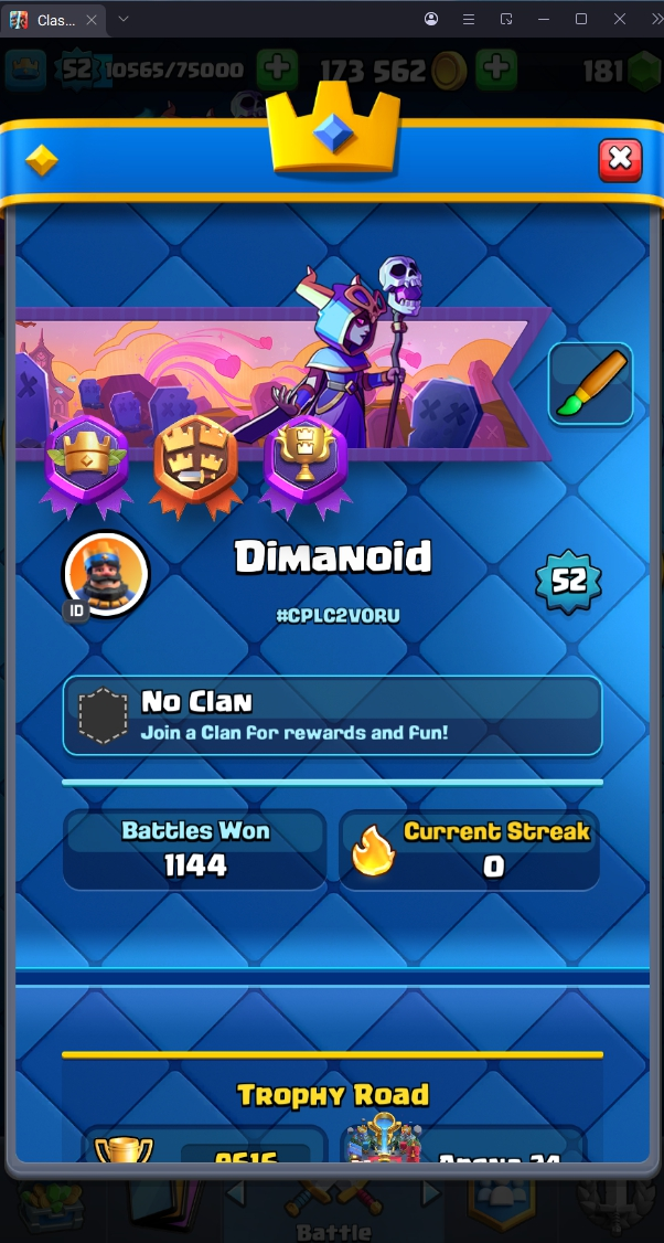 9616 TROPHY 🏆 52 LVL 💯 KT 14 👑 120 CARDS ♦️ 5 MAX CARDS 👑 6 ELITE CARDS 🔮 13 EVO 💯 EMOTE 69 🎭 #CPLC2V0RU ⸱ TAG ACCOUNT ♥️