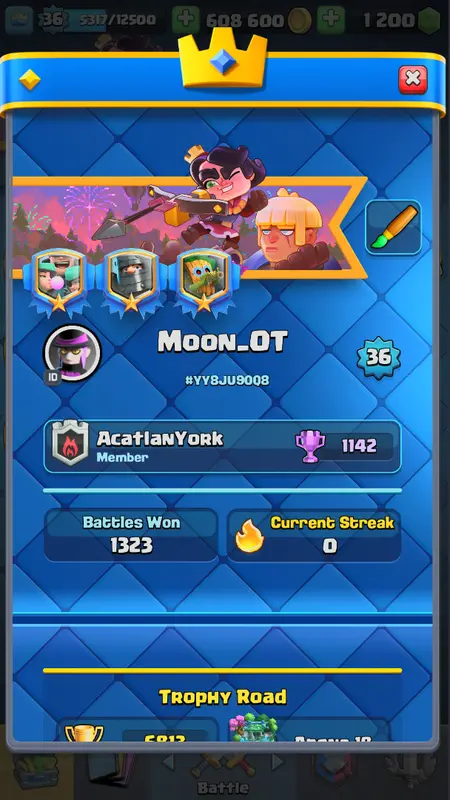 CL6202 KT 12 LEVEL 36 | 2 Evolution | Trophies:6813 | 115 Cards | 3 Cards (14LVL) | 5 Tower Skins | 22 Emotes | 608K Gold | 1200 Gems | IOS/ANDROID