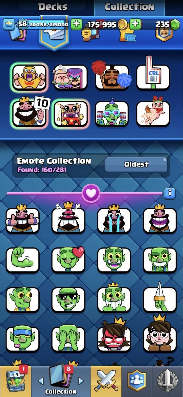 #CRL 1 EMOTE ✨ KT 15 🔱 LVL 58 🏆 CUPS[8745] ✨ MAX CARDS [55] ✨ ELITE [16] ✨ EVO [6] ✨ LVL 14 [39] ✨ EMOTES [160] ✨ SKINS [6] 🔱 CARDS [117] ✨FREE SQUAD BUSTER ✨ 10000% SAFE