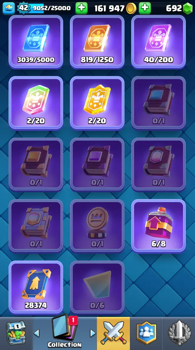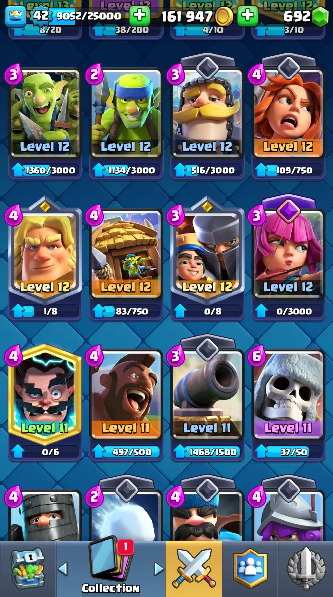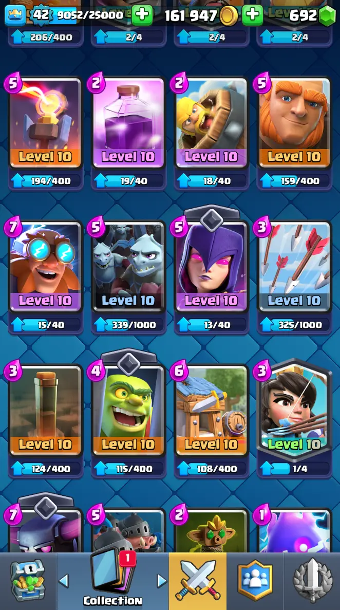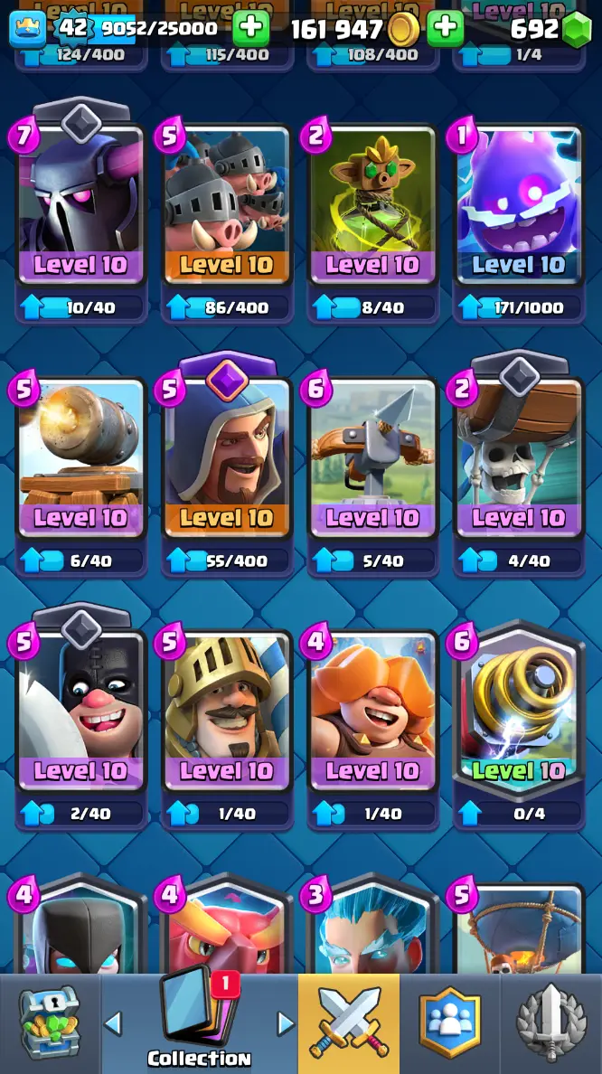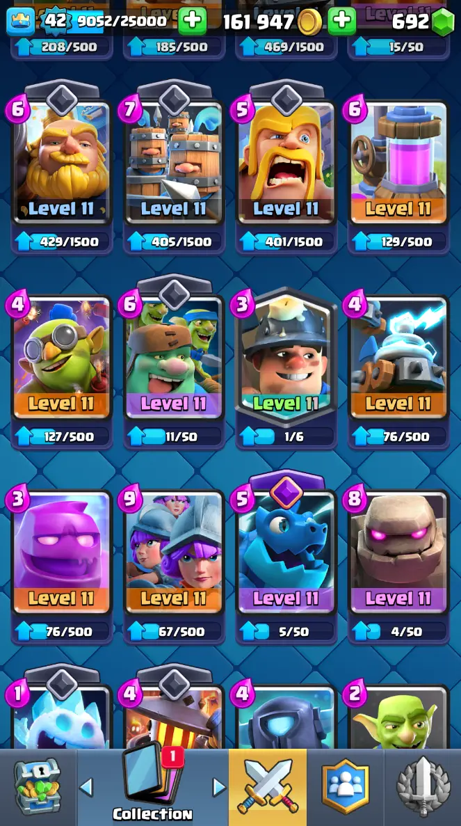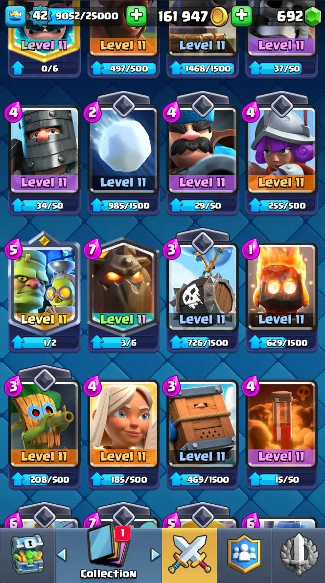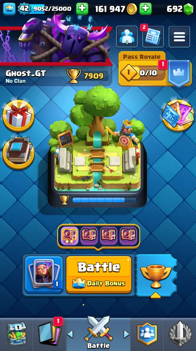 ◀️ KT 14 ▶️ LEVEL 42 🤩 7909 TROPHIES 🏆 1 ELITE CARD 🙀 2 MAX CARD 😎 6 EVO ☠️ 37 EMOTE 😍 3 SKIN 👽 115 CARDS 💳 161k GOLD 💰 692 GEMS 💎 RT97