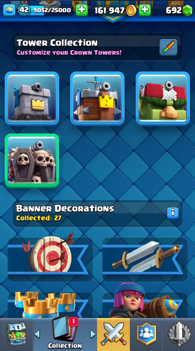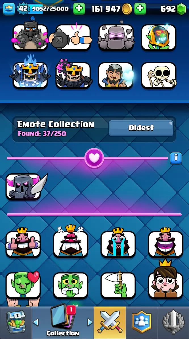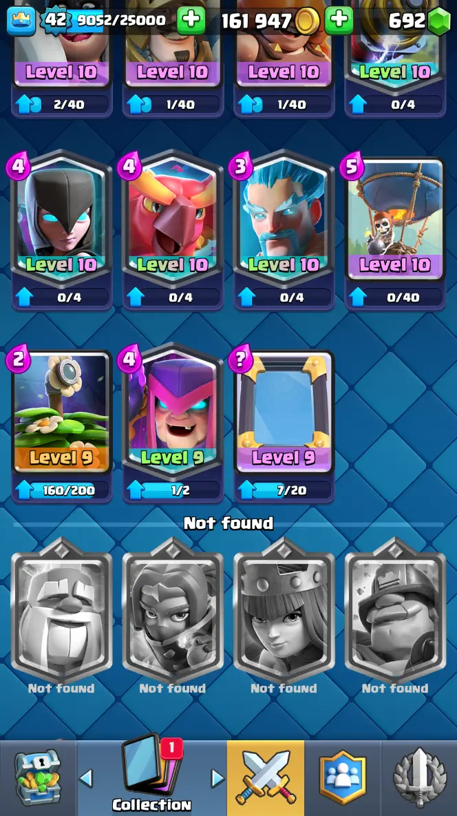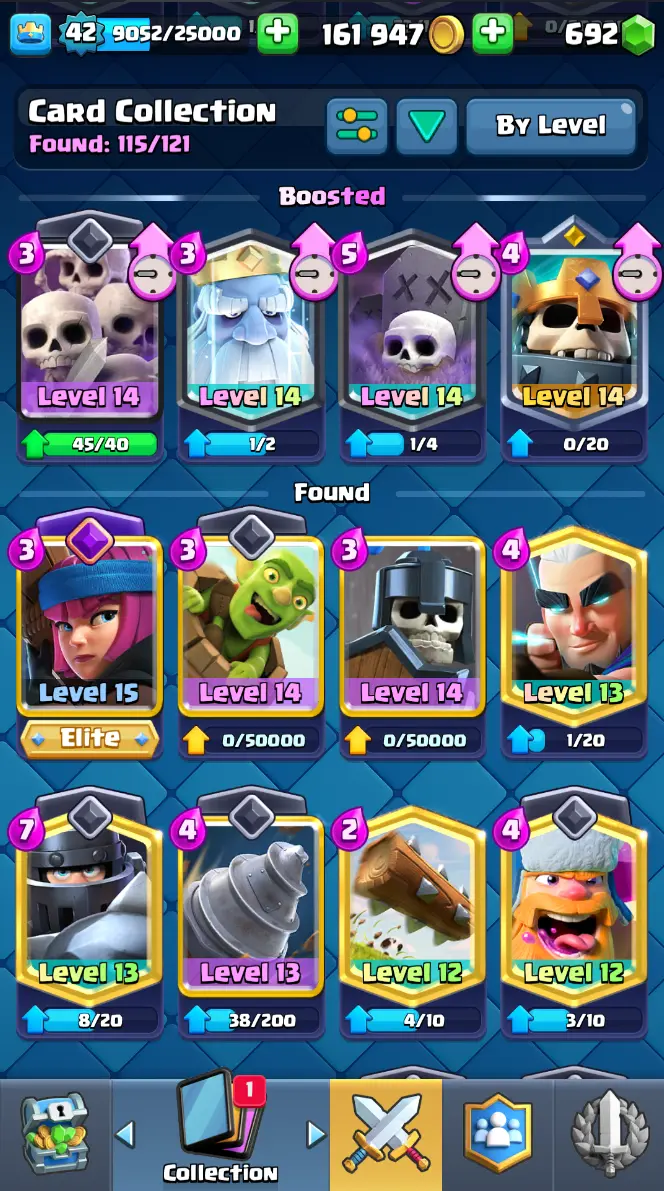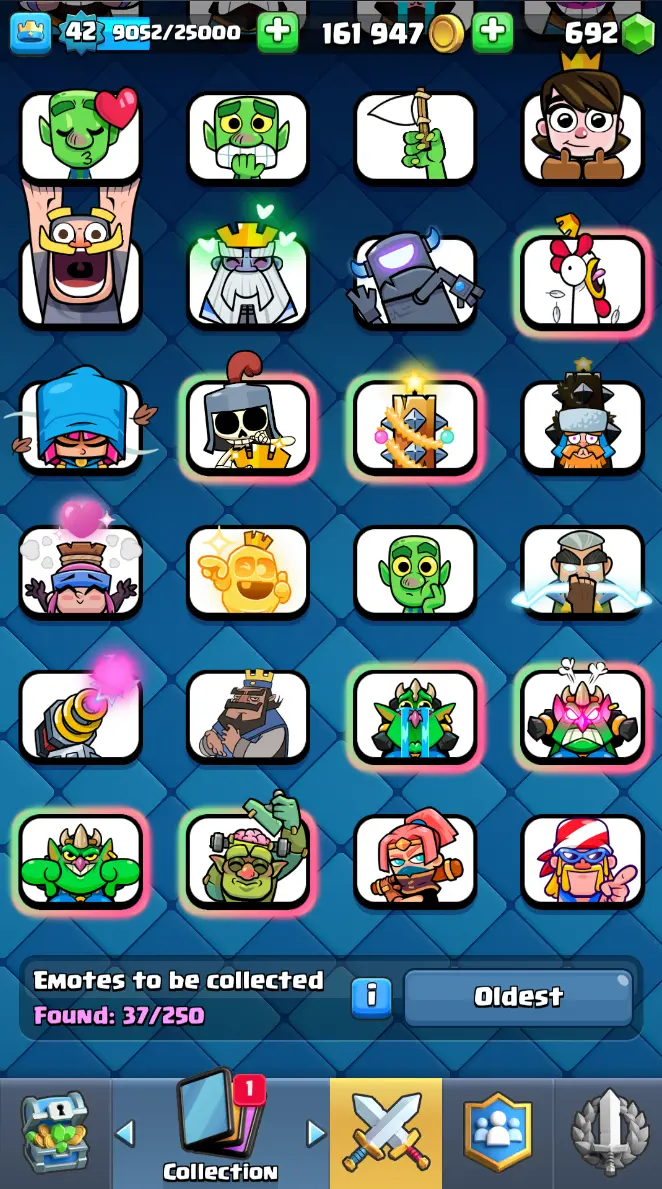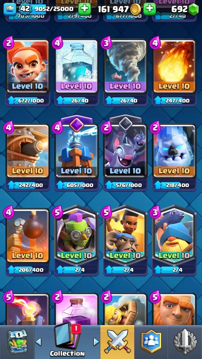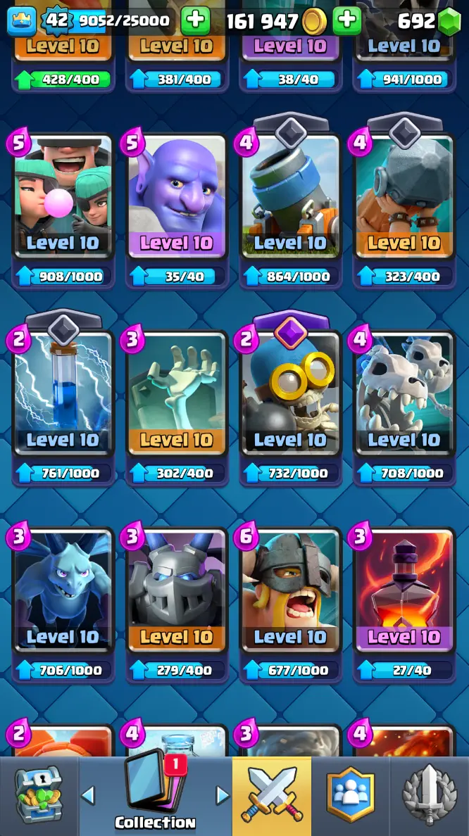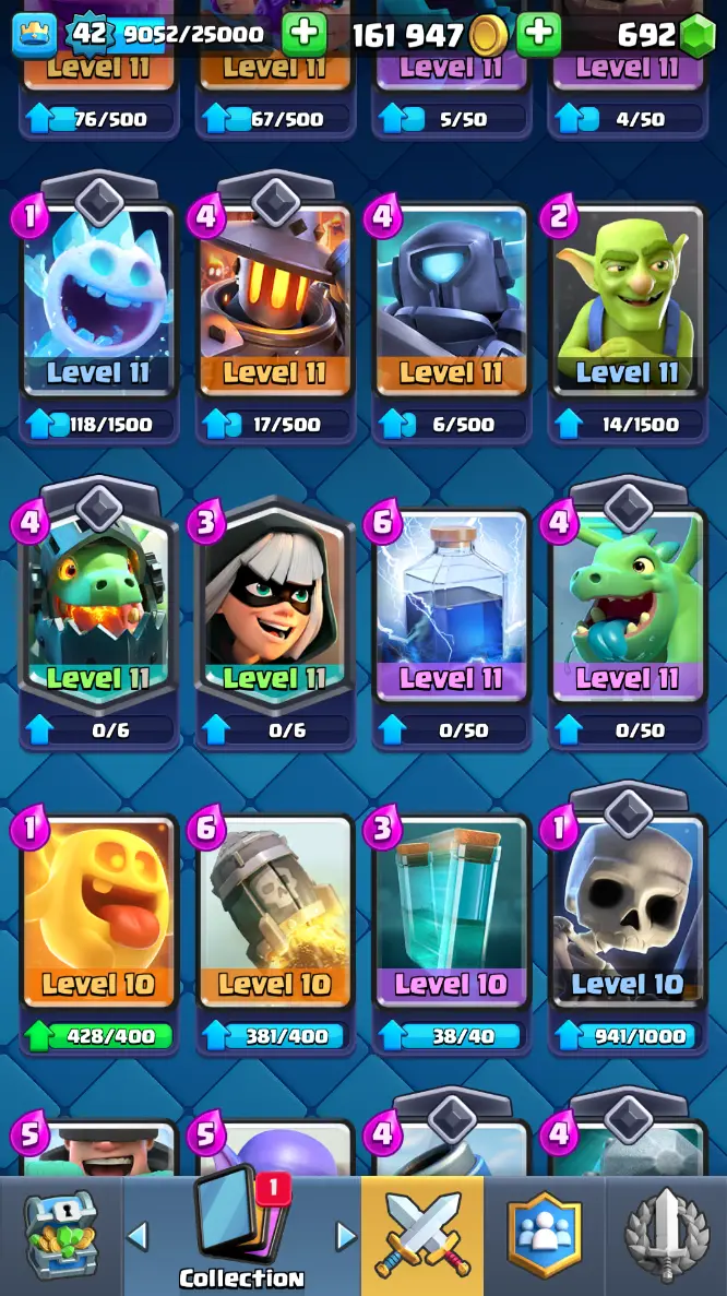 ◀️ KT 14 ▶️ LEVEL 42 🤩 7909 TROPHIES 🏆 1 ELITE CARD 🙀 2 MAX CARD 😎 6 EVO ☠️ 37 EMOTE 😍 3 SKIN 👽 115 CARDS 💳 161k GOLD 💰 692 GEMS 💎 RT97