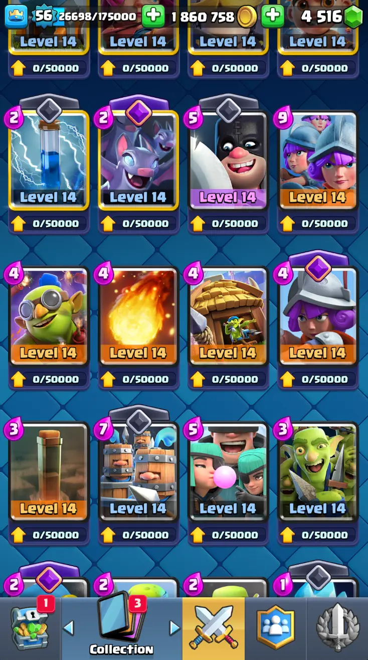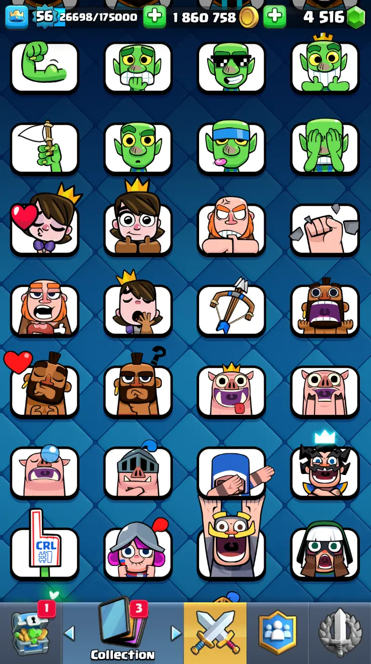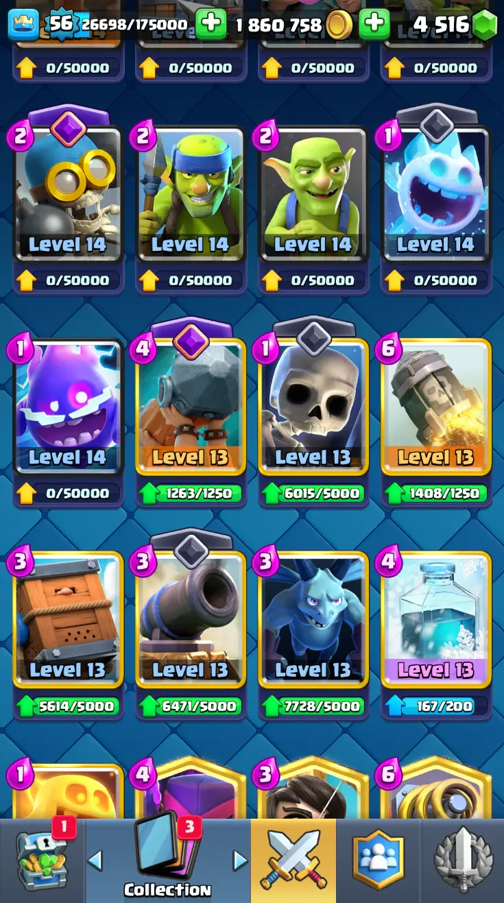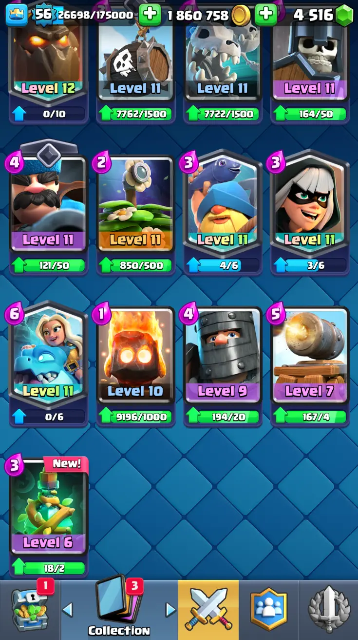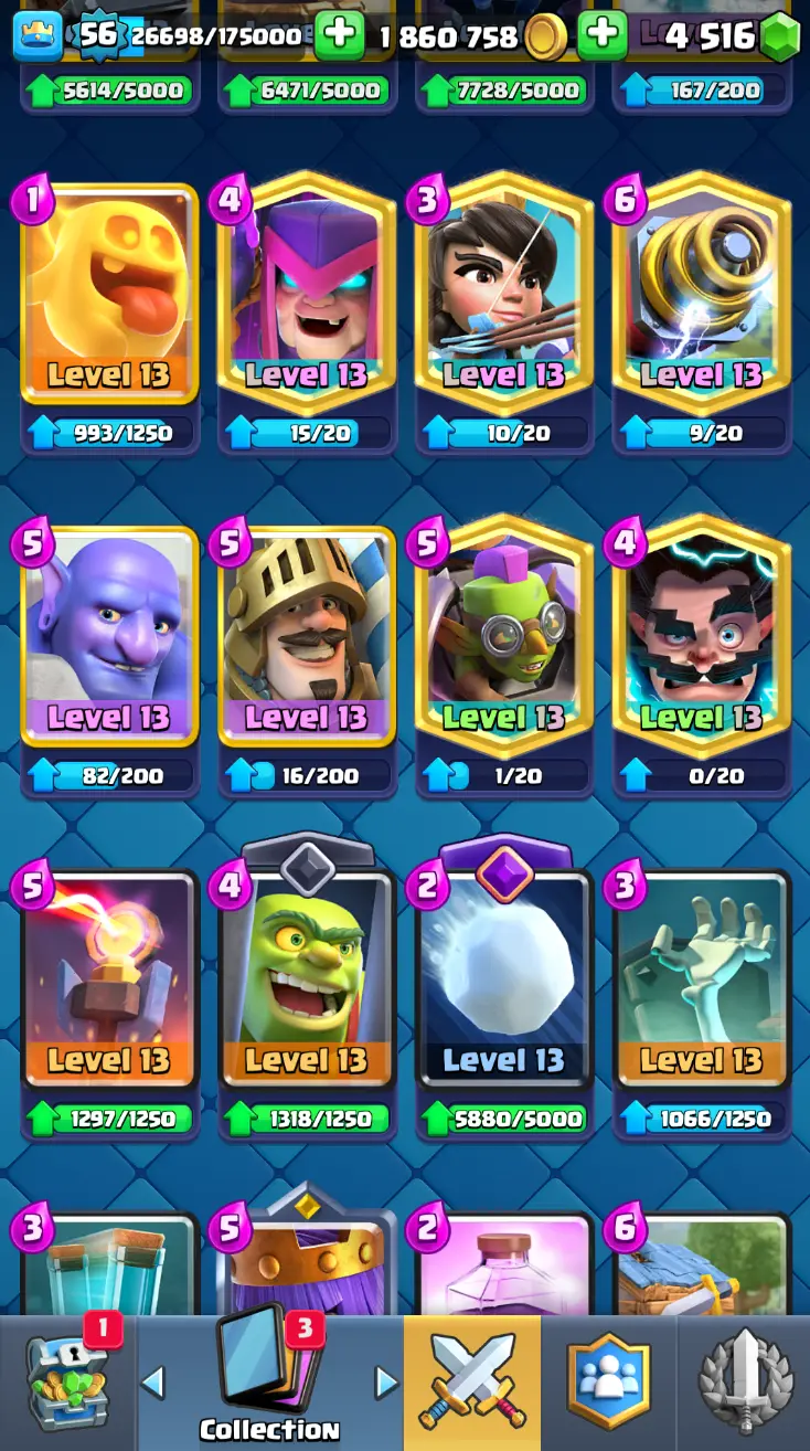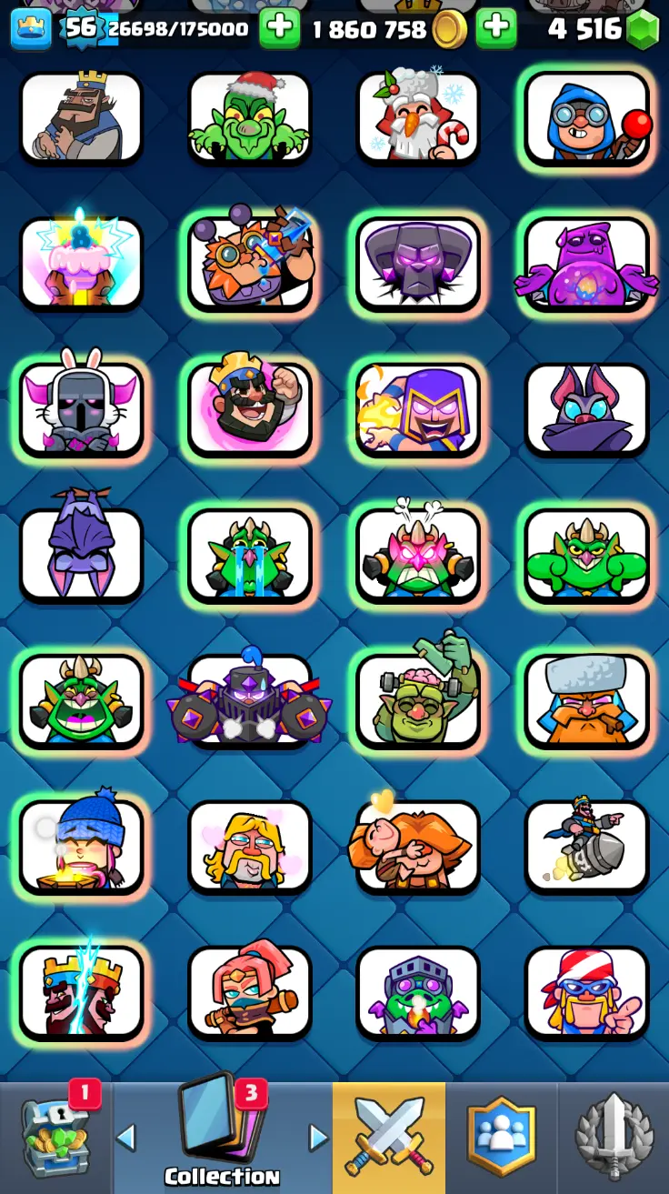 ◀️ KT 15 ▶️ LEVEL 56 🤩 8558 TROPHIES 🏆 8 ELITE CARD 🙀 42 MAX CARD 😎 17 EVO ☠️ 105 EMOTE 😍 13 SKIN 👽 121 CARDS 💳 1.8m GOLD 💰 4516 GEMS 💎 RL148