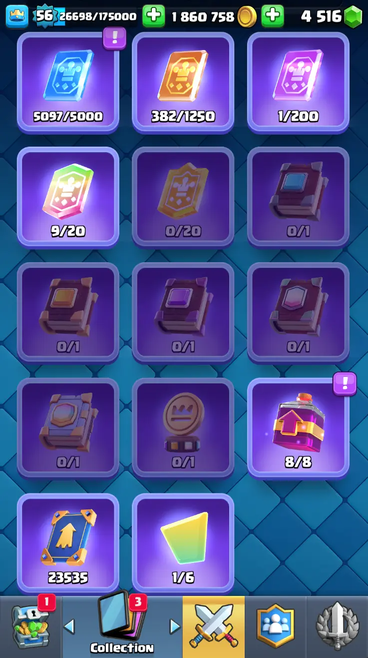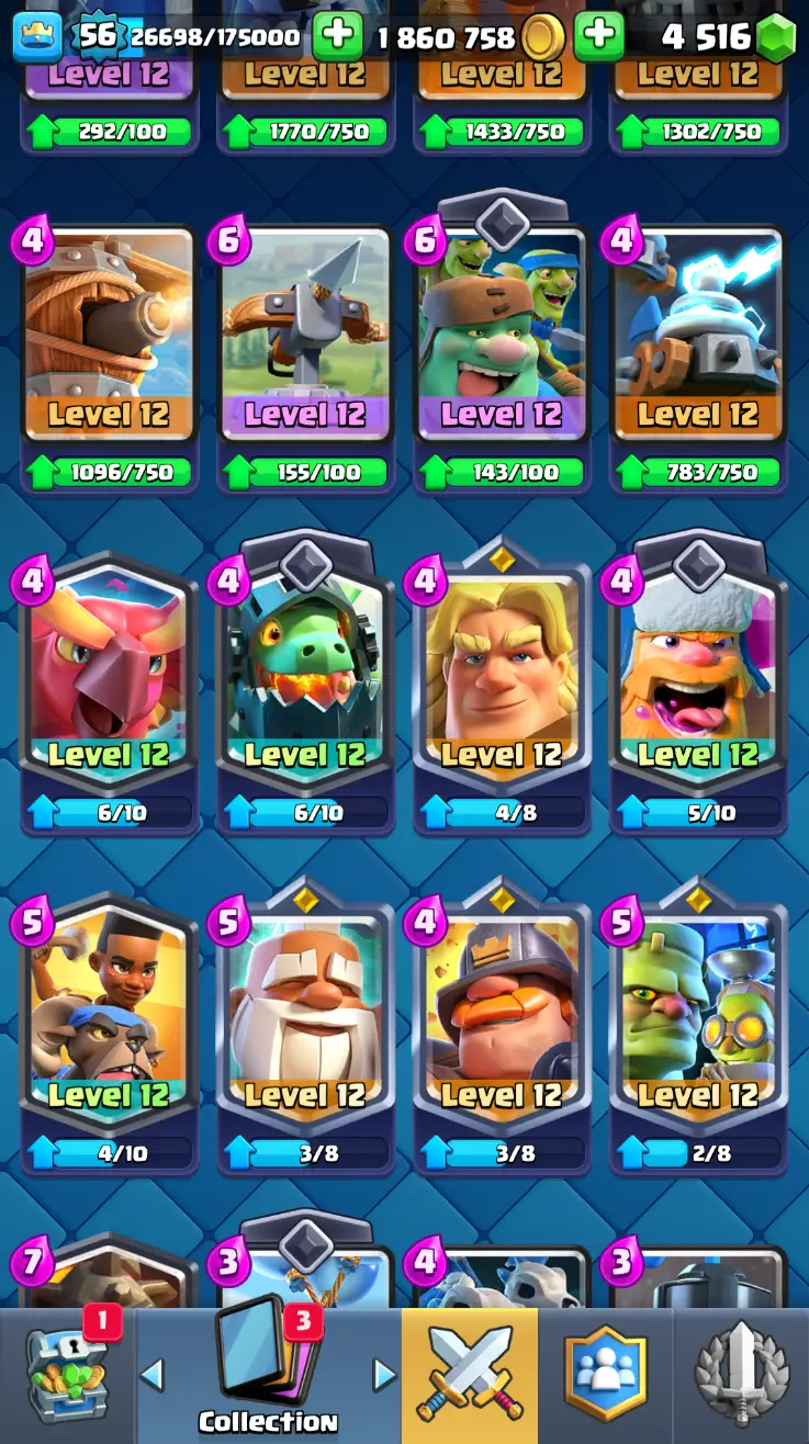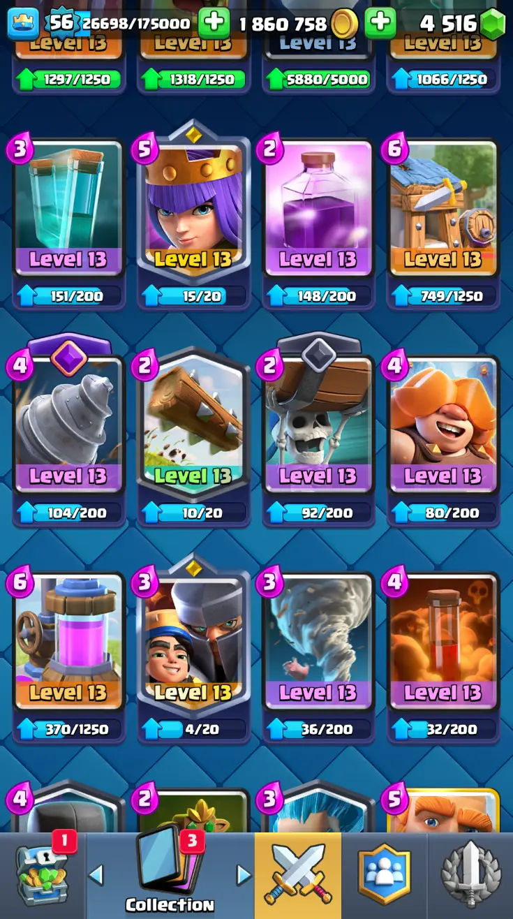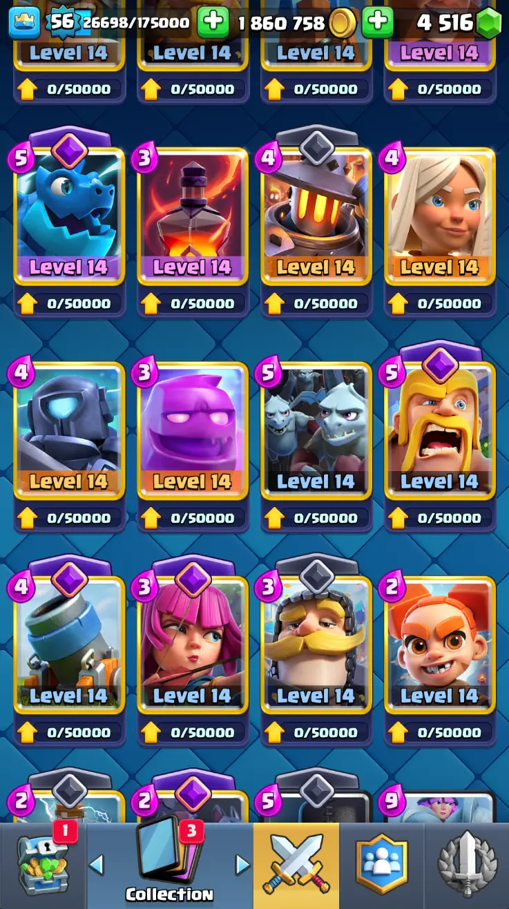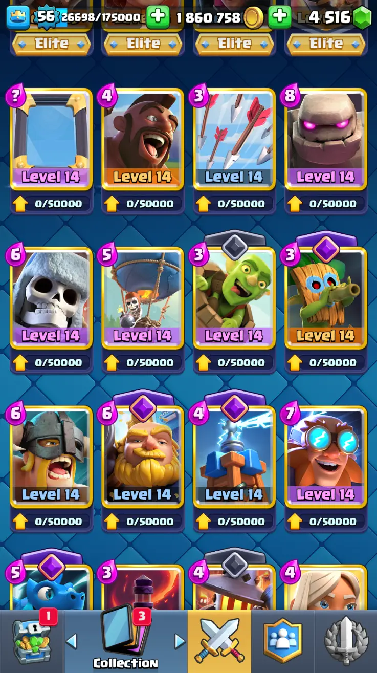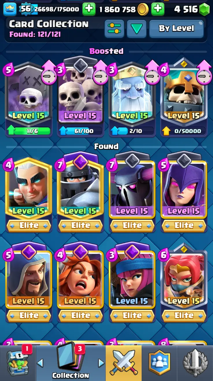 ◀️ KT 15 ▶️ LEVEL 56 🤩 8558 TROPHIES 🏆 8 ELITE CARD 🙀 42 MAX CARD 😎 17 EVO ☠️ 105 EMOTE 😍 13 SKIN 👽 121 CARDS 💳 1.8m GOLD 💰 4516 GEMS 💎 RL148