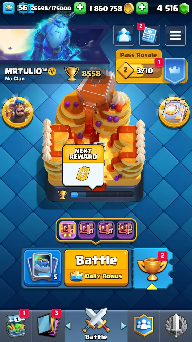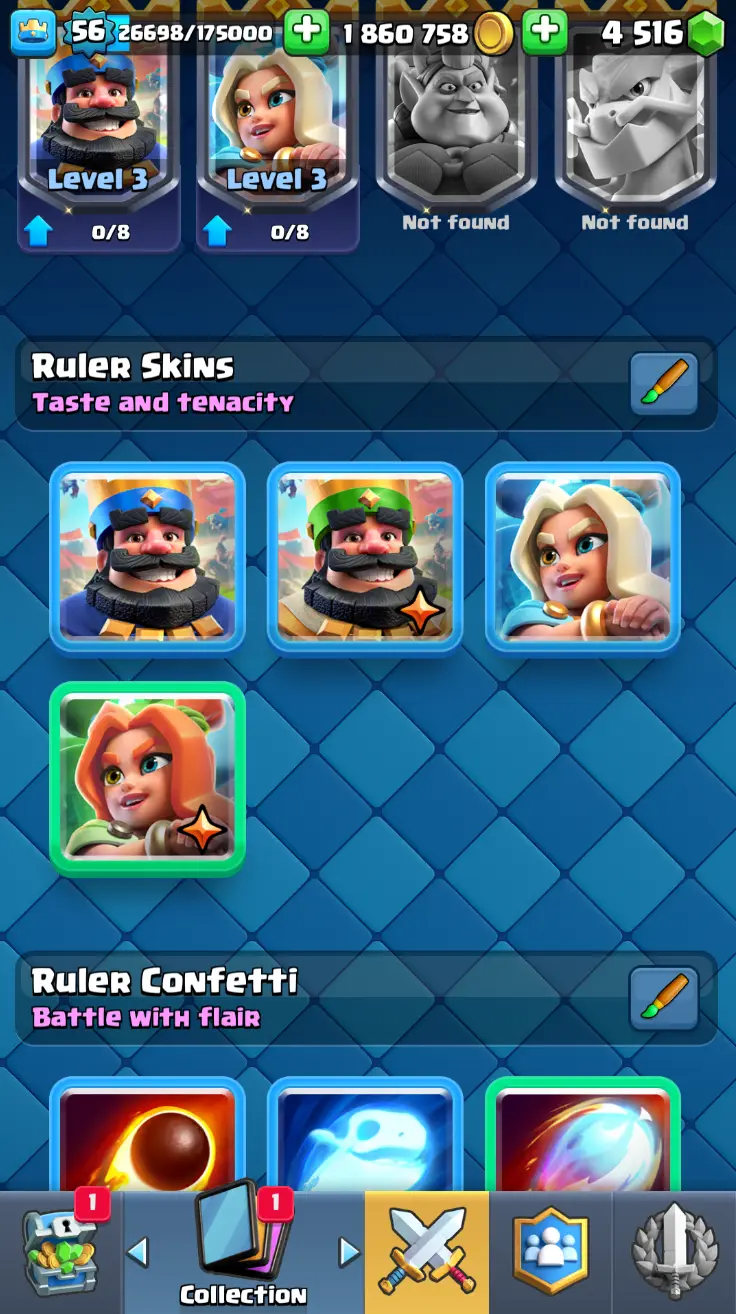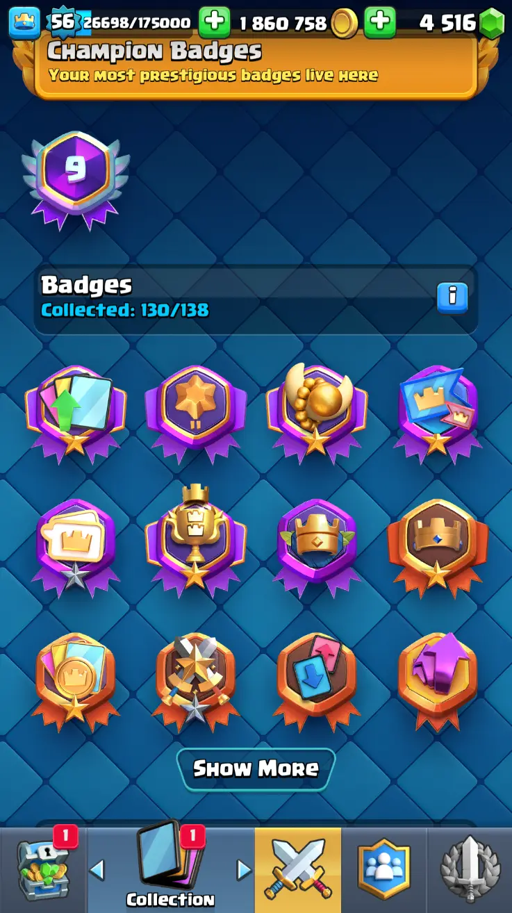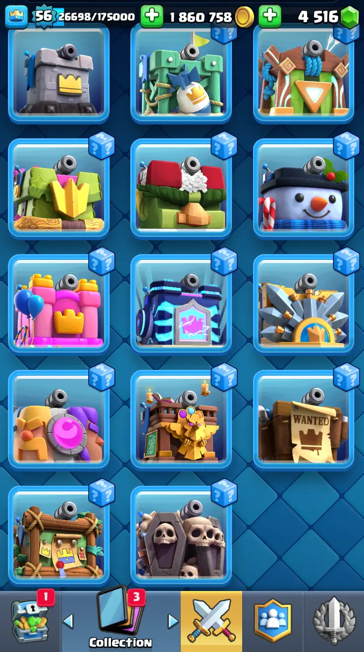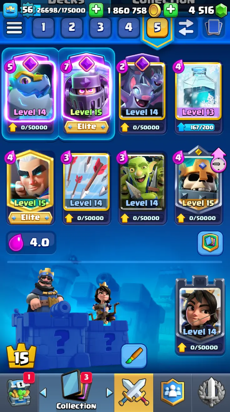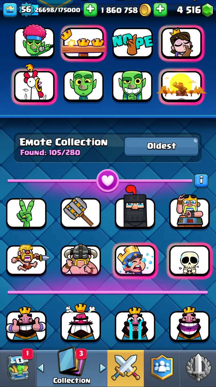 ◀️ KT 15 ▶️ LEVEL 56 🤩 8558 TROPHIES 🏆 8 ELITE CARD 🙀 42 MAX CARD 😎 17 EVO ☠️ 105 EMOTE 😍 13 SKIN 👽 121 CARDS 💳 1.8m GOLD 💰 4516 GEMS 💎 RL148