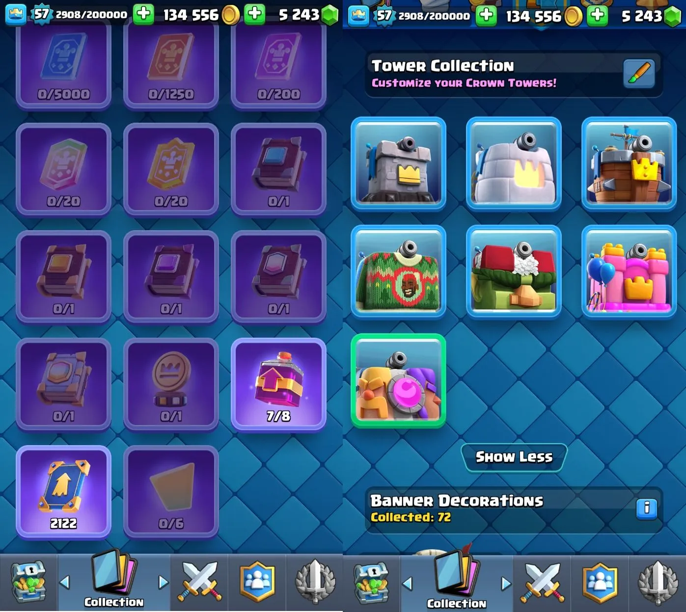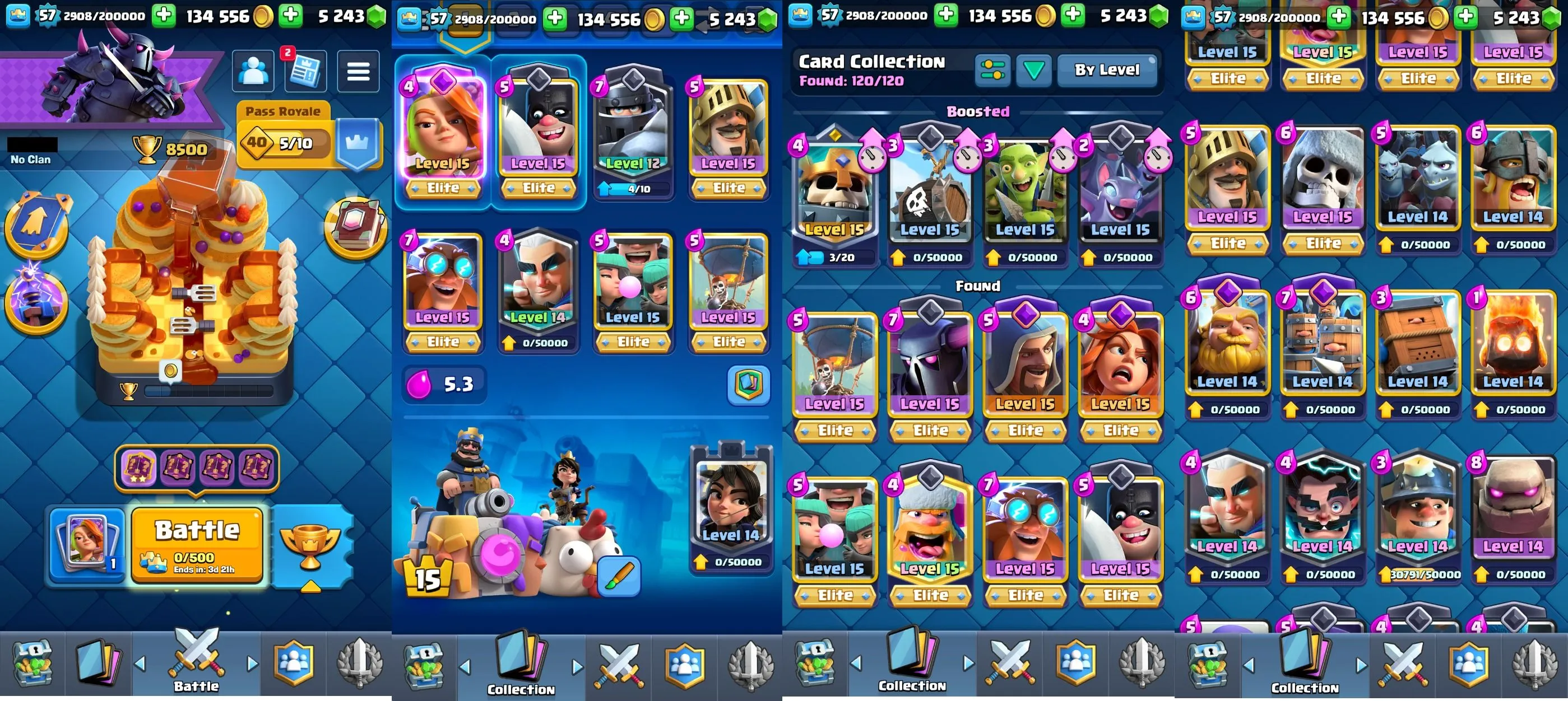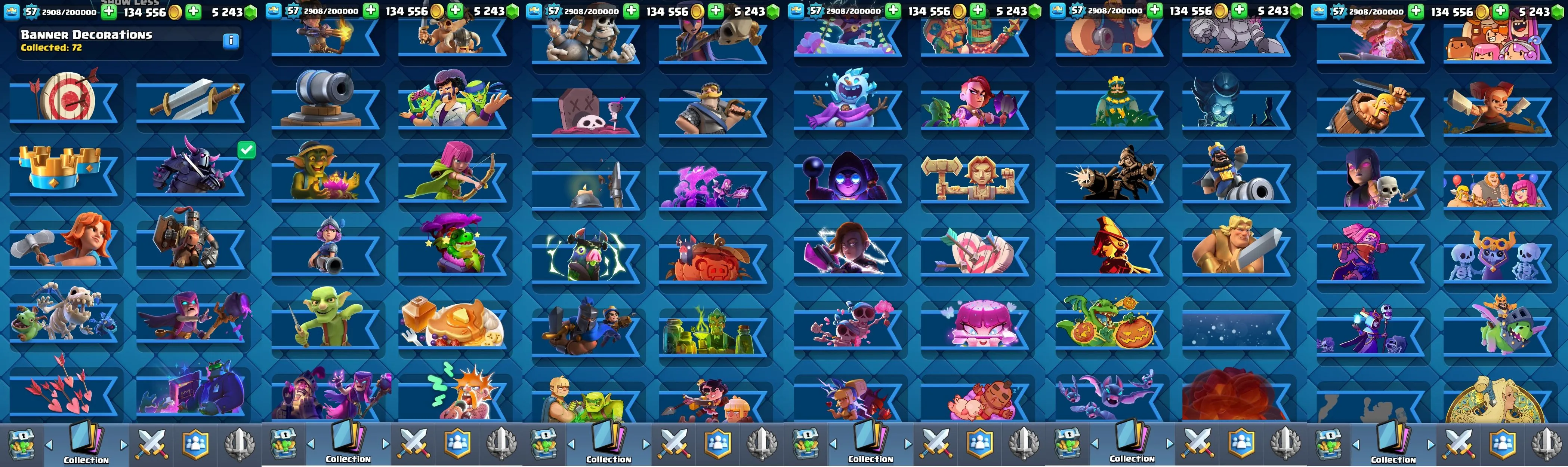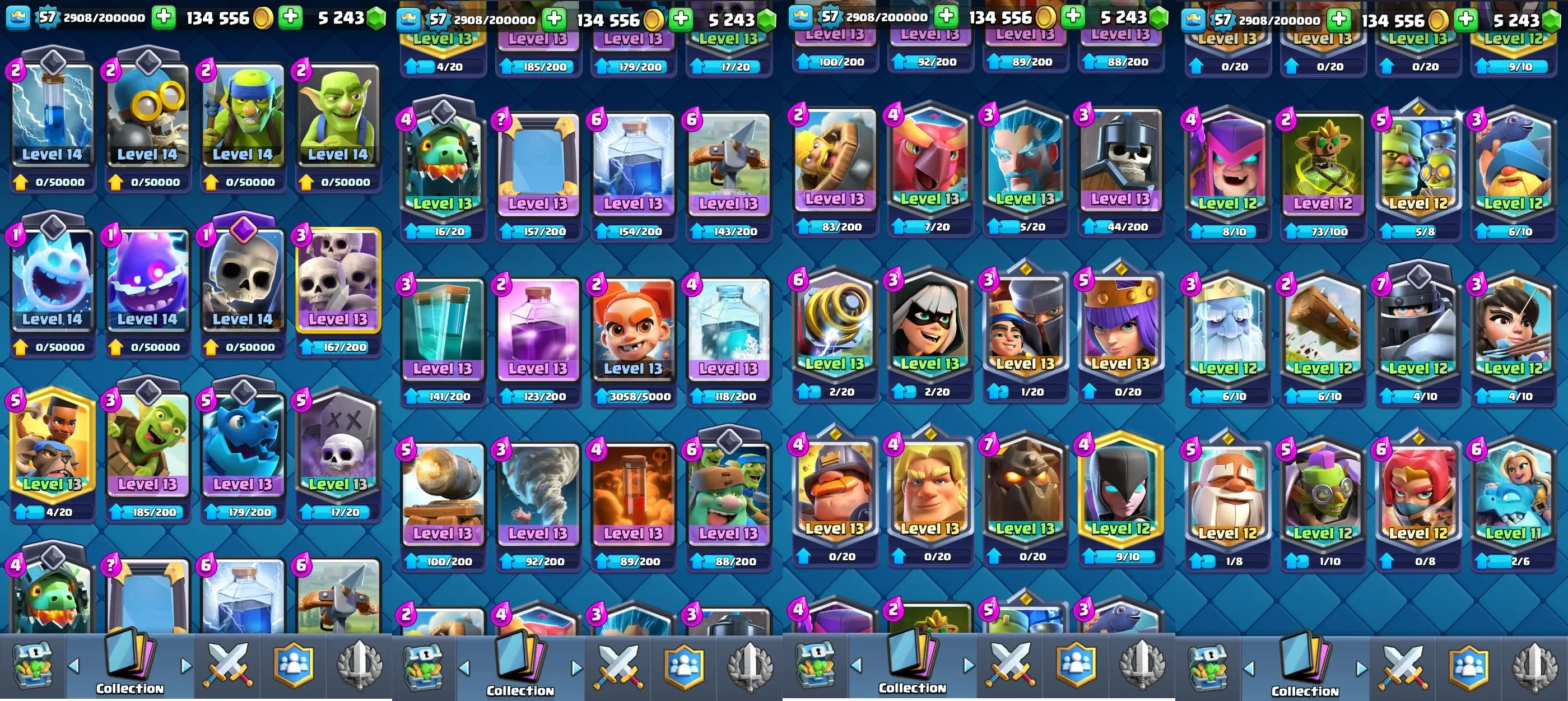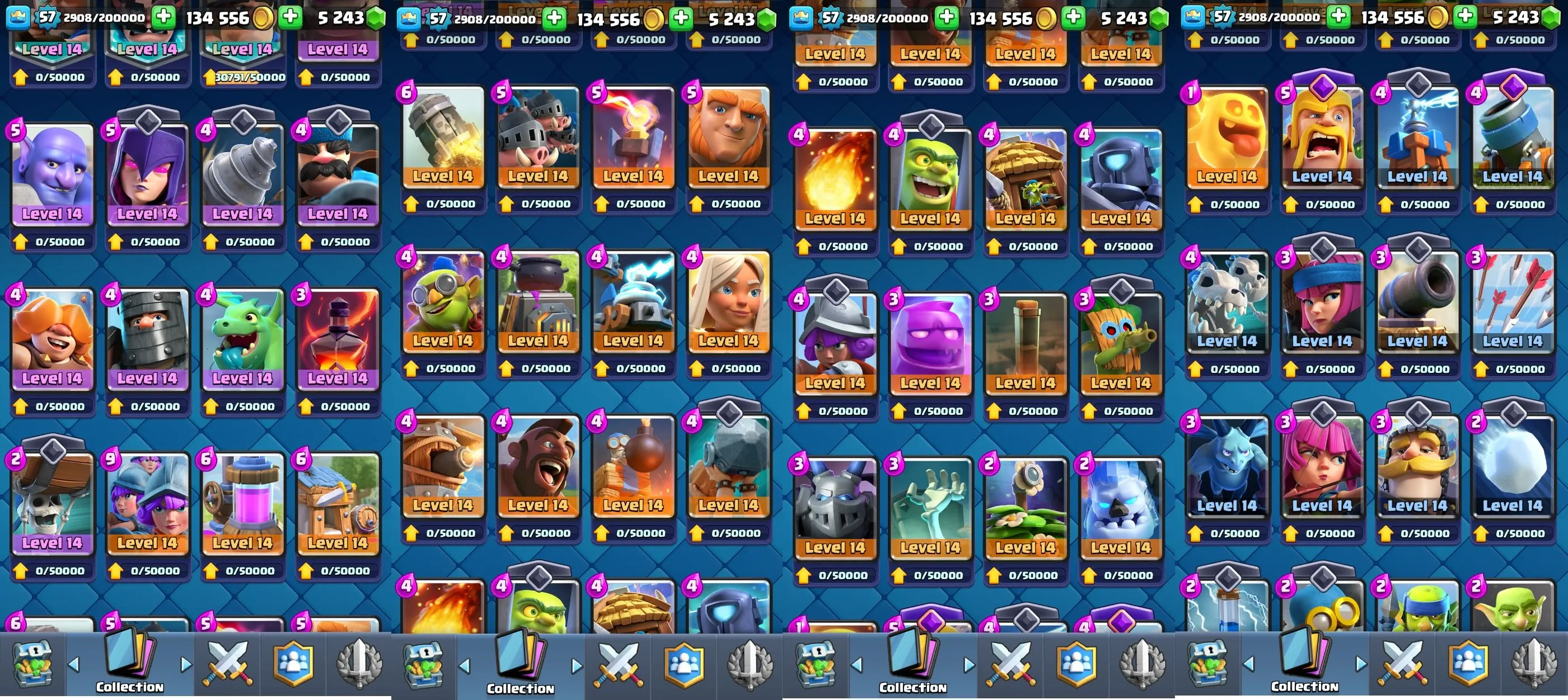 ◀️ KT 15 ▶️ LEVEL 57 🤩 8500 TROPHIES 🏆 10 ELITE CARD 🙀 68 MAX CARD 😎 7 EVO ☠️ 38 EMOTE 😍 7 SKIN 👽 120 CARDS 💳 134k GOLD 💰 5243 GEMS 💎 RL18