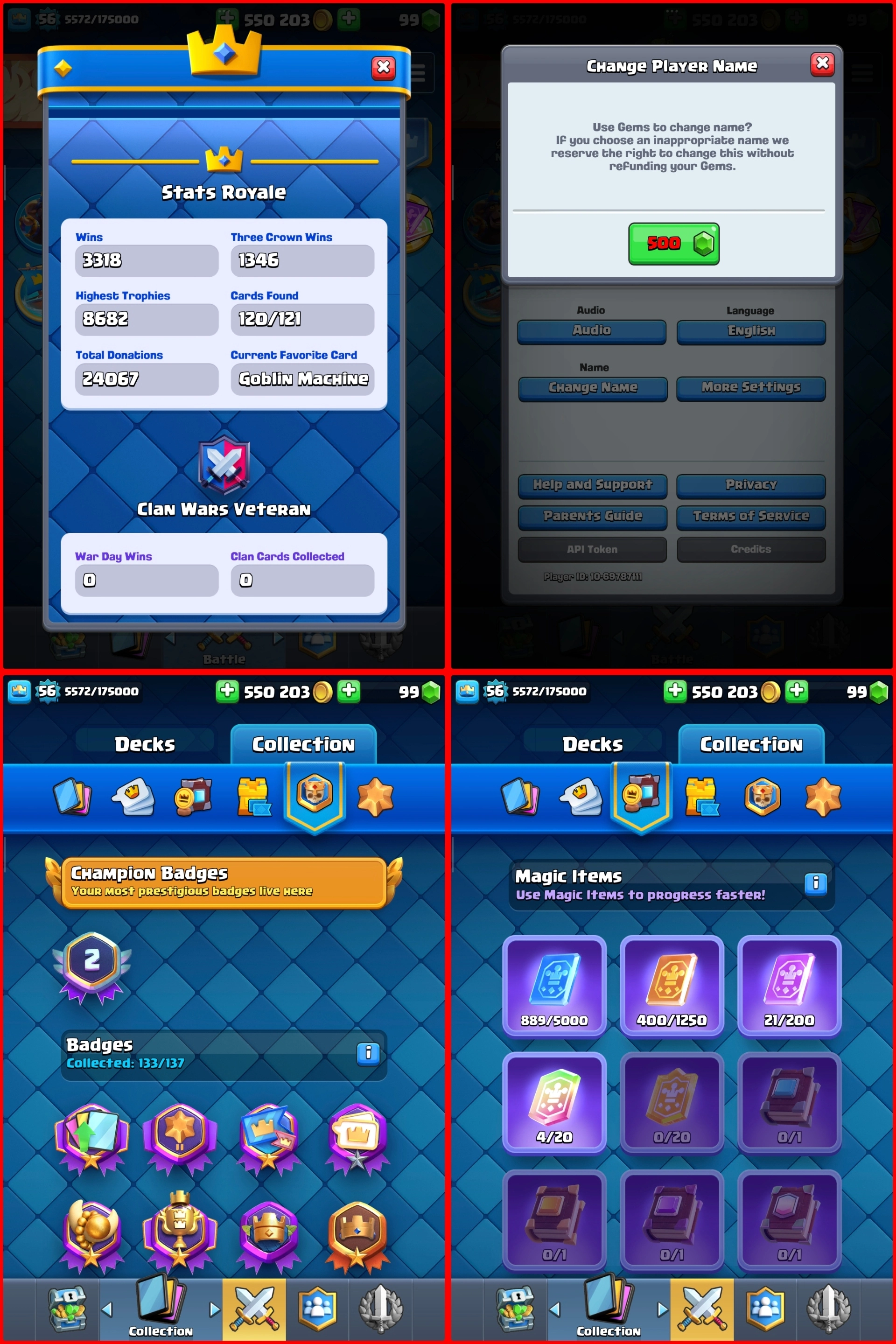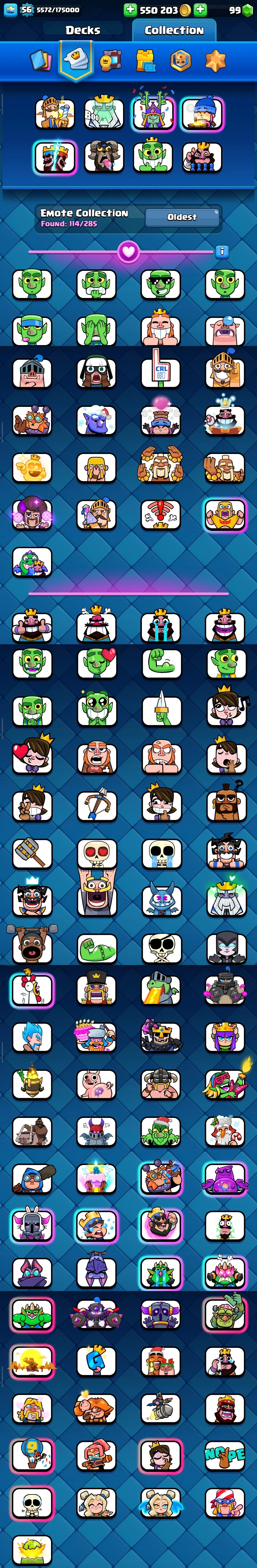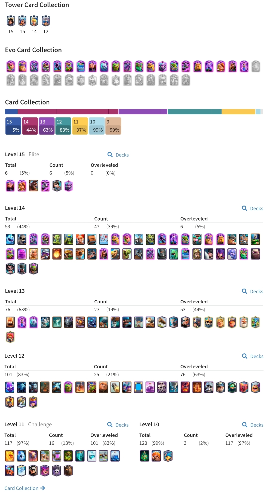 Level 56, 120 ALL Cards | 21 Evolution Unlock + 53 Cards Max | 47 Level 14 Cards & 6 Level 15 | 114 Nice Emotes, Low 500 NC | RC16