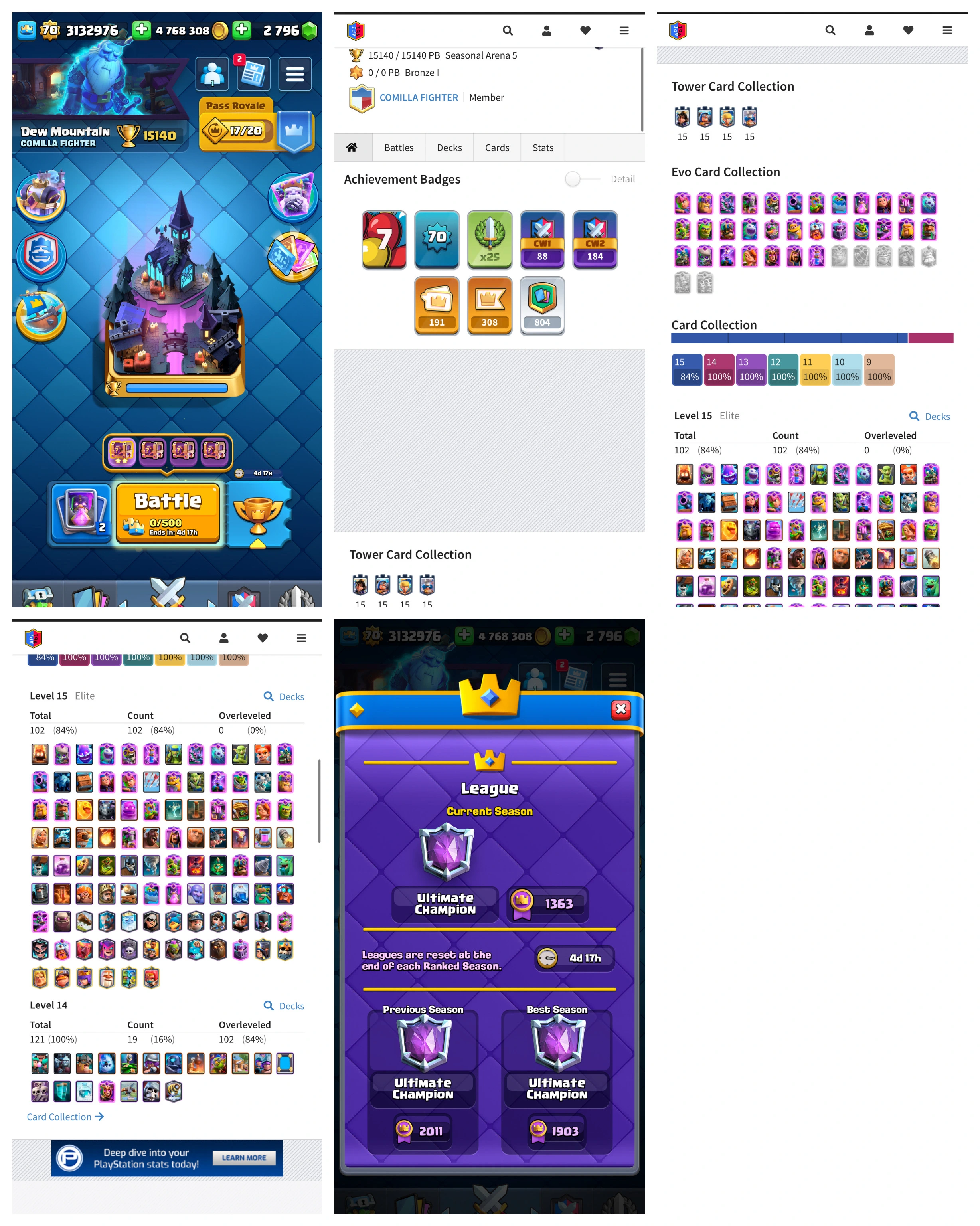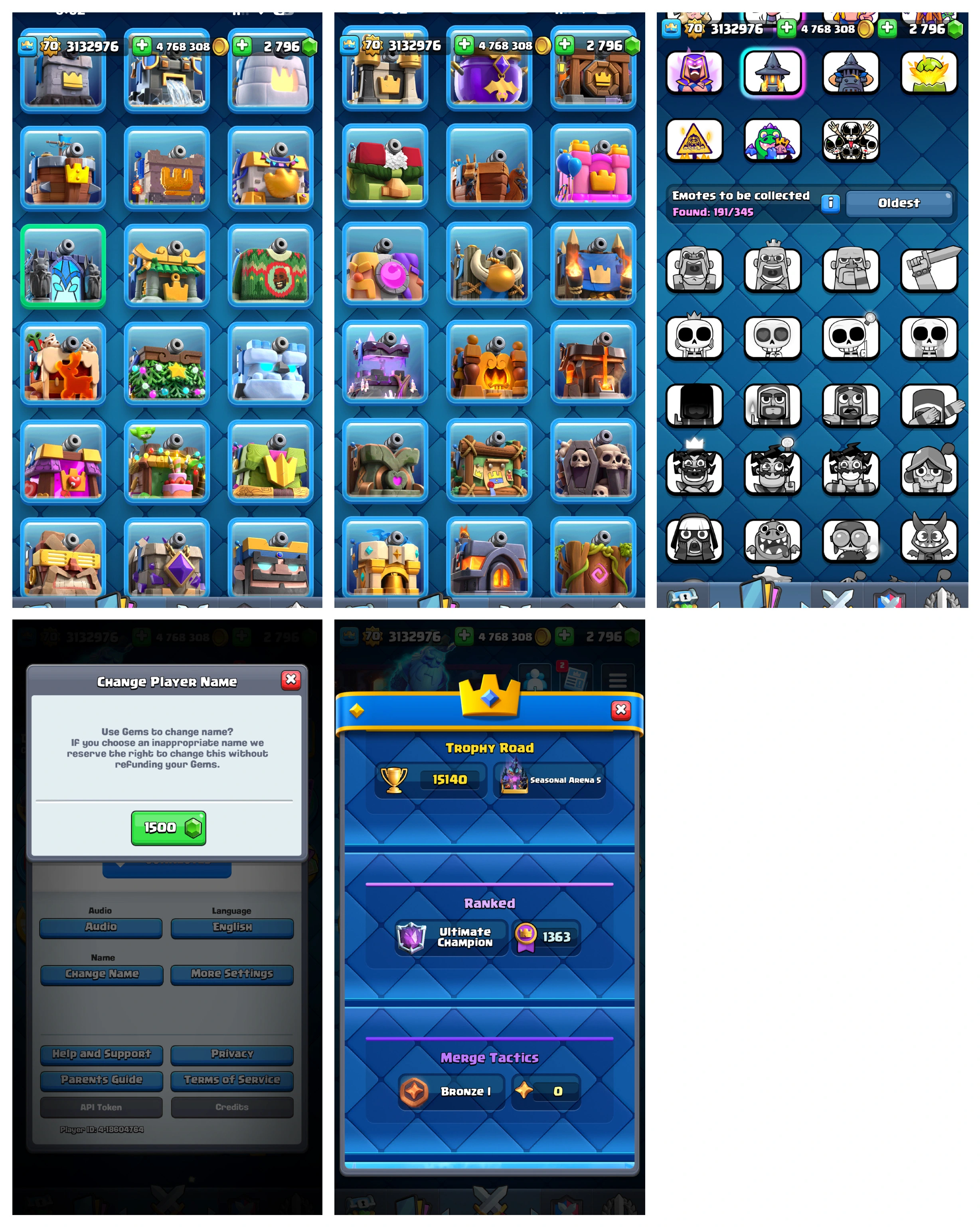 WORLD TOP RAREST ✅ KT 15 (LVL.70) ALL EVO (31)✅ ALL ELITE (106)✅ ULTIMATE CHAMPION ✅ EMOTES-191✅ ALL TOWER SKIN (36) 15K TROPHY ✅ ALL CARD MAX  ✅ 4.7M GOLD ✅ TROPHY KISSING, PEKKA BALLON & UC RAREST EMOTES✅ANDROID & IOS