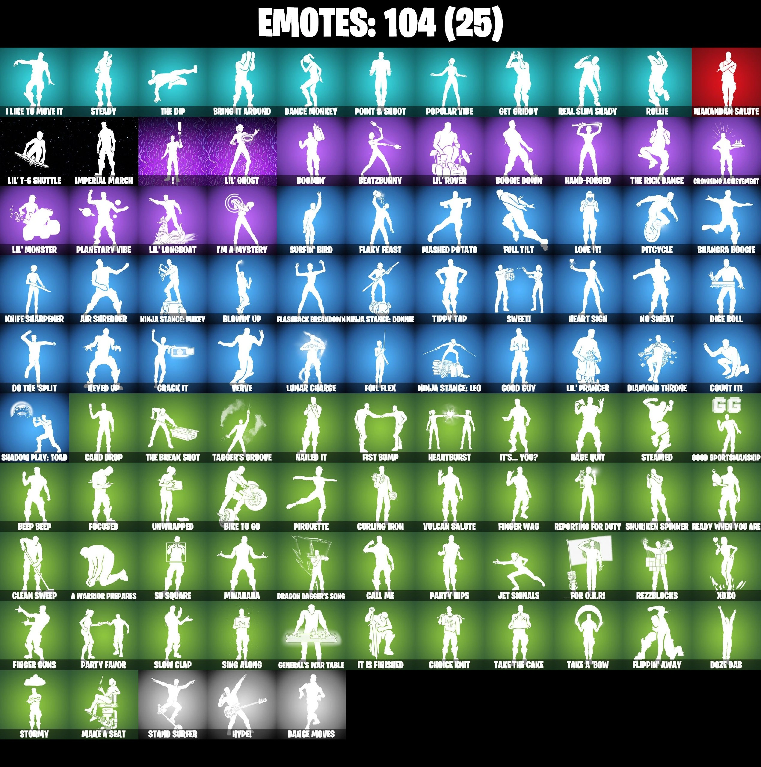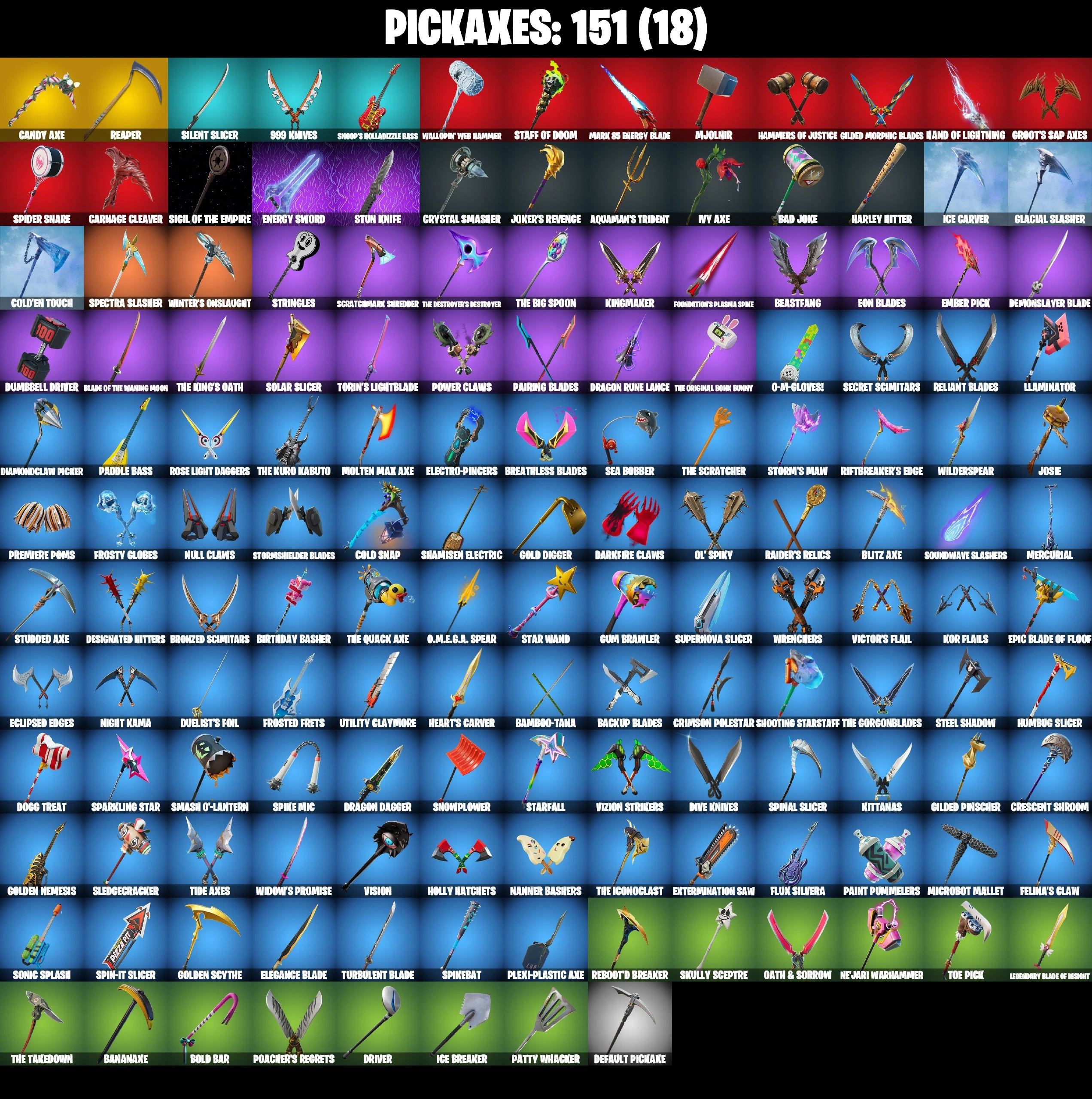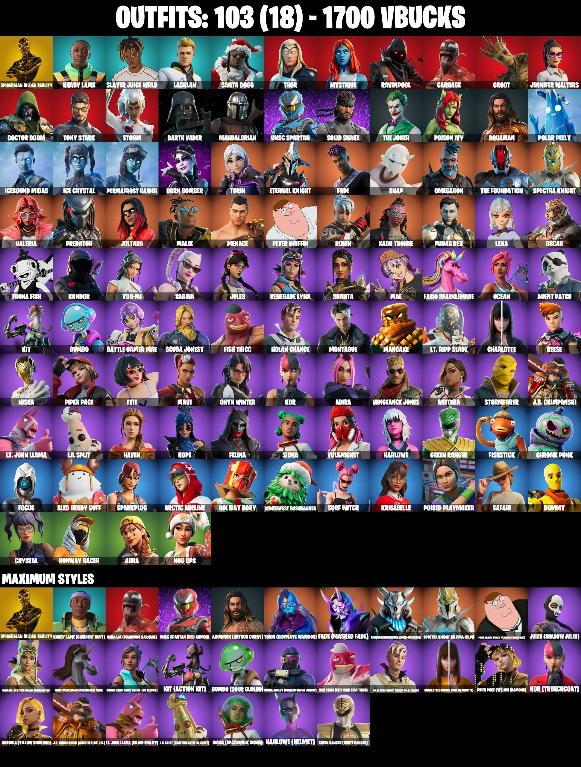 103 SKINS ⸱ CANDY AXE ⸱ THE JOKER ⸱ SPIDER-MAN MAXED ⸱ POISON IVY ⸱ JOLTARA ⸱ GREEN RANGER ⸱ FISHSTICK ⸱ AGENT PATCH ⸱ SURF WITCH ⸱ ONYX WINTER ⸱ KOR ⸱ LT. RIPP SLADE ⸱ STAR WAND ⸱ CISION ⸱ ICE BREAKER ⸱ FADE ⸱ UNSC SPARTAN ⸱ MENA