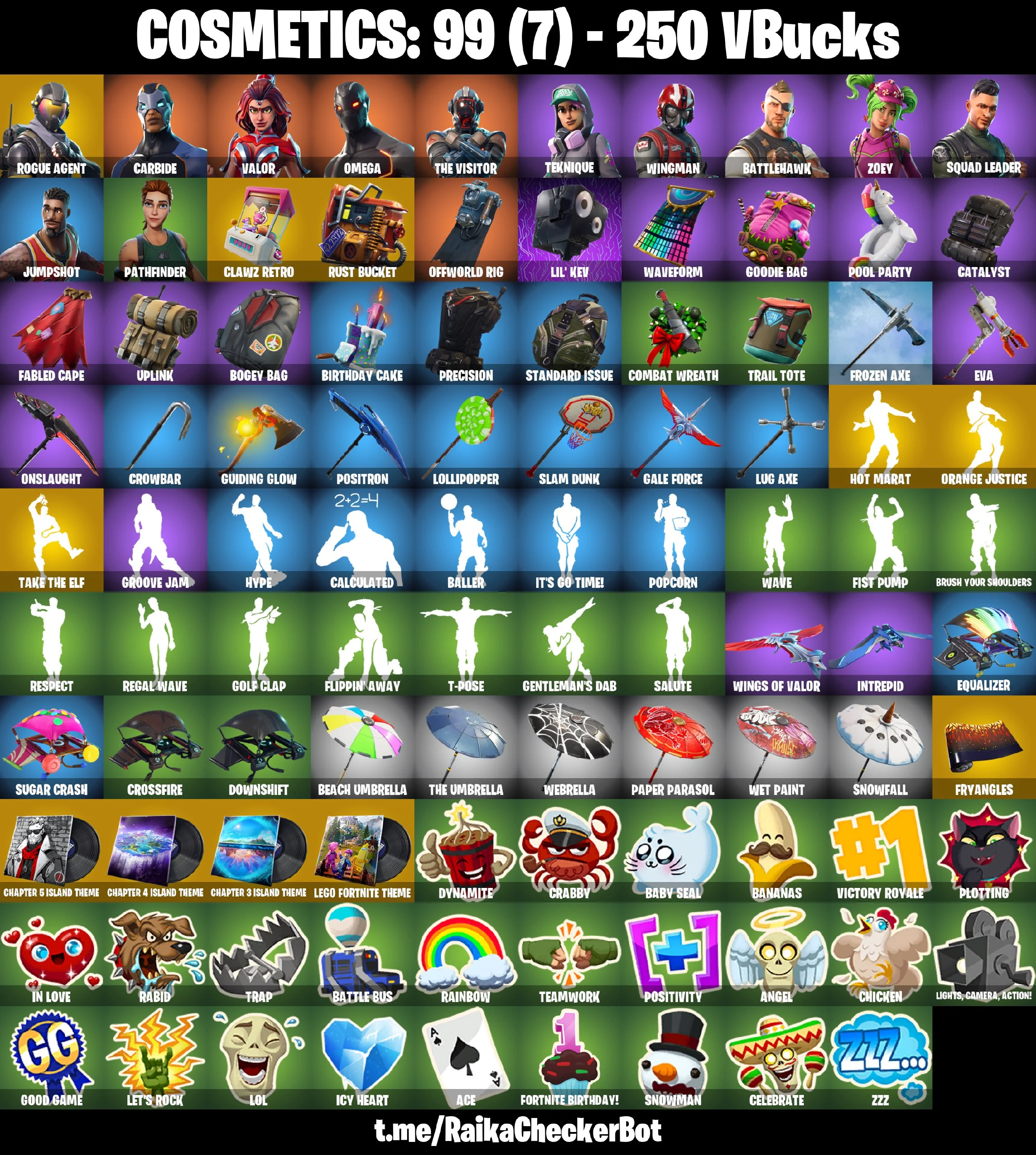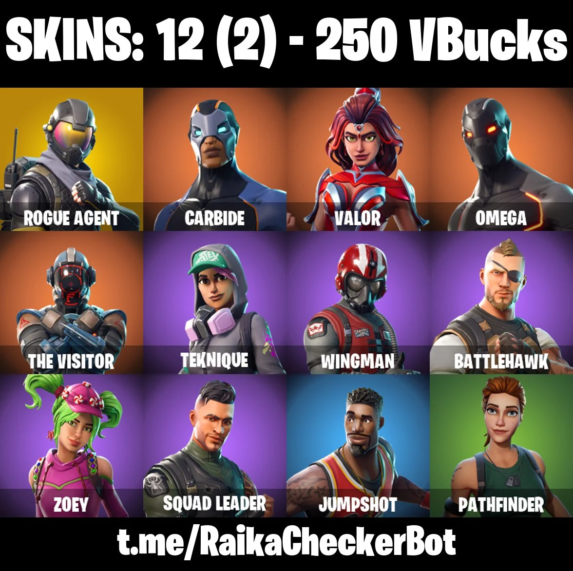 12 skins Omega 🔹 Crowbar 🔹 Rogue Agent 🔹 Carbide 🔹 Valor 🔹 The Visitor 🔹 Teknique 🔹 Wingman 🔹 Battlehawk 🔹 Zoey 🔹 Squad Leader 🔹 Jumpshot PSN/XBOX/PC