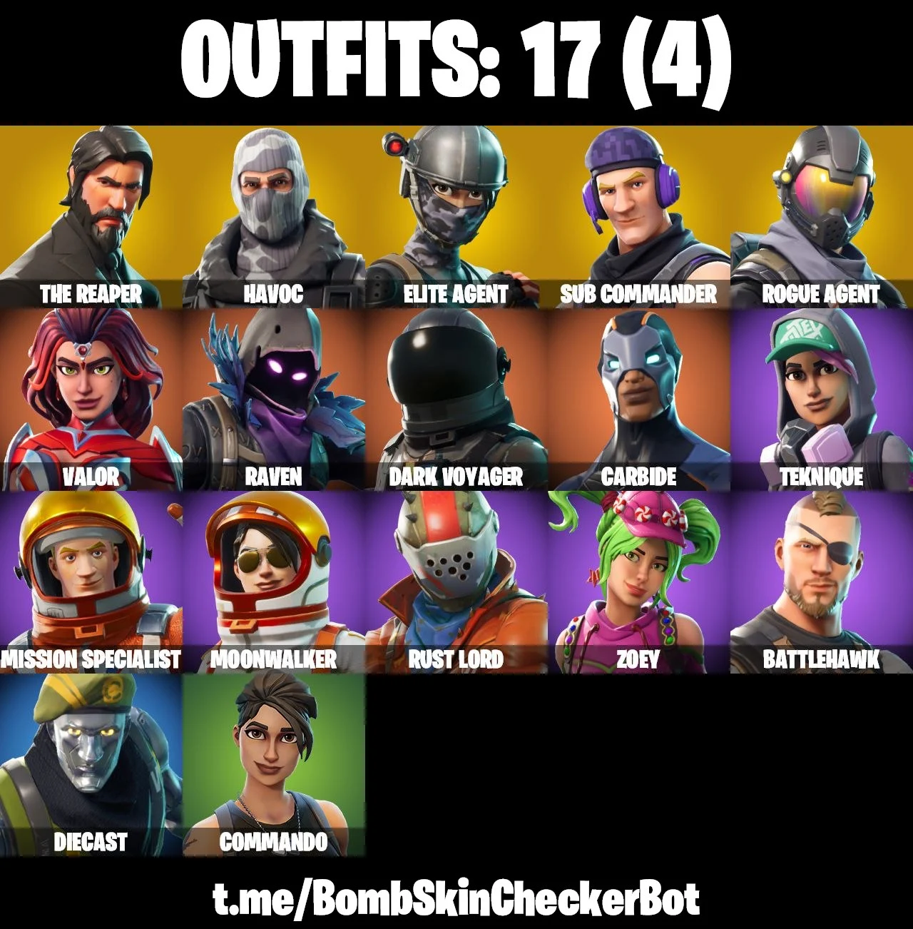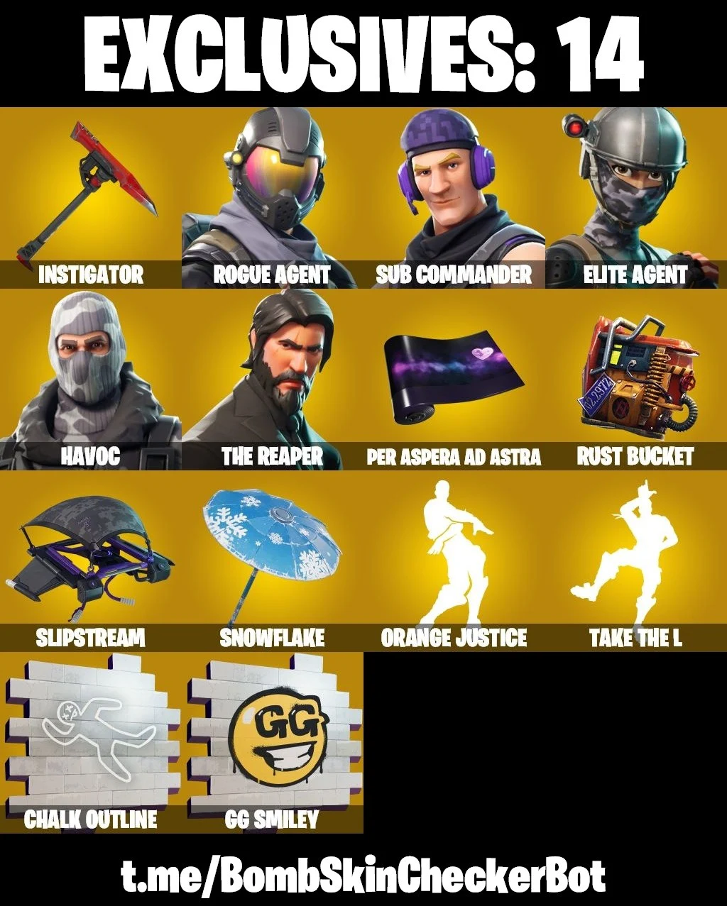 🔮17 Skins🔮 The Reaper💎Take The L💎Rogue Agent💎Elite Agent💎Havoc💎Sub Commander💎Rust Bucket💎Crowbar💎Orange Justice💎Snowflake