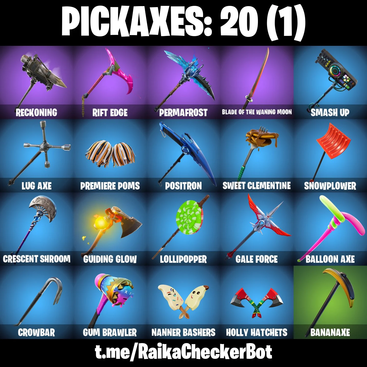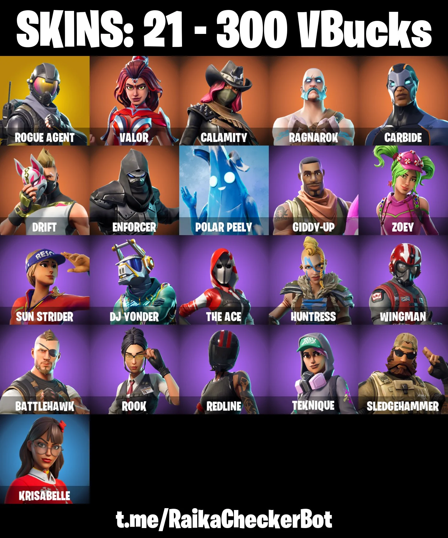 21 skins Rogue Agent 🔹 Crowbar🔹 Rollie 🔹 Valor 🔹 Calamity 🔹 Ragnarok 🔹 Carbide 🔹 Drift 🔹 Enforcer 🔹 Polar Peely 🔹 Giddy-up 🔹 Zoey PSN/XBOX/PC