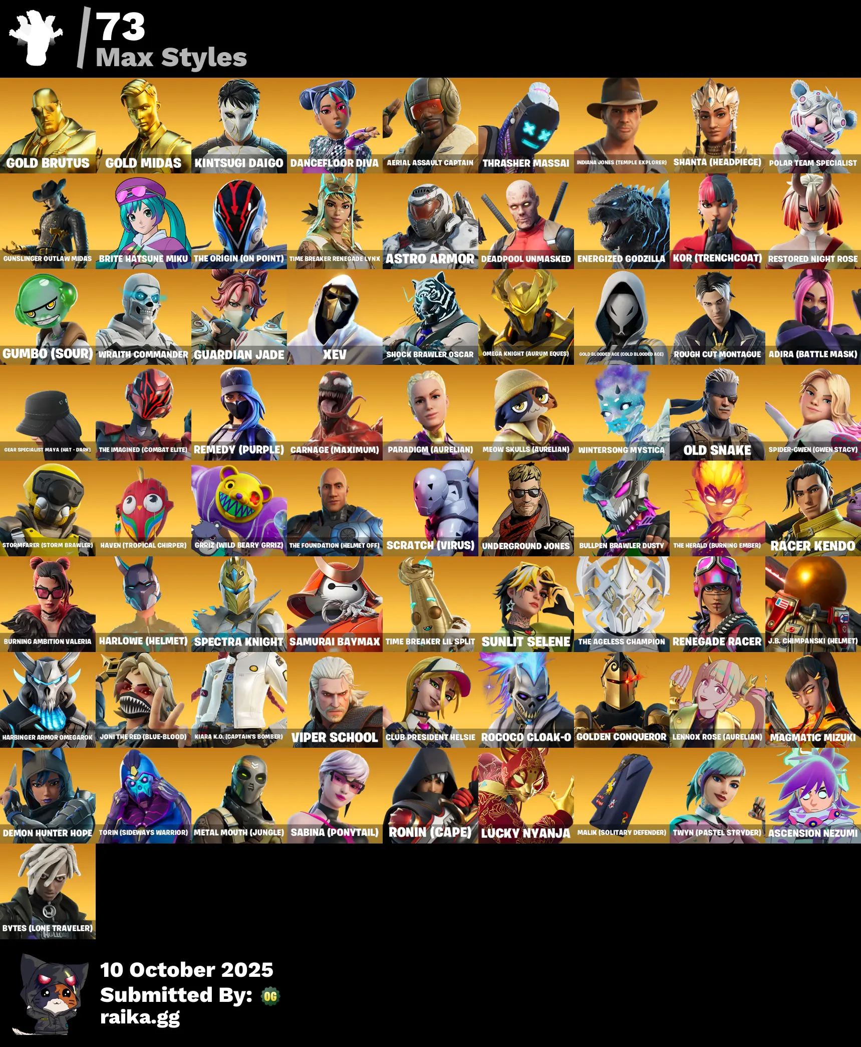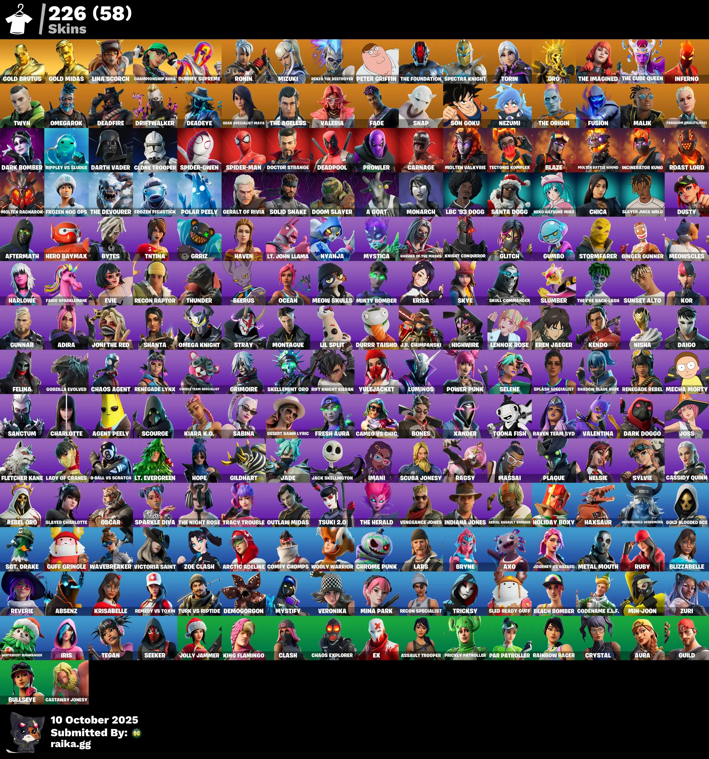 226 skins | Jack Skellington🎃Snap🎃Oro🎃Son Goku🎃Fusion🎃Valeria🎃Renzo the Destroyer🎃Peter Griffin🎃Gold Midas🎃Nezumi🎃Gold Brutus🎃Torin🎃Omegarok🎃Paradigm (Reality-659)🎃The Ageless🎃Dummy Supreme🎃Driftwalker🎃Lina Scorch🎃Deadey🎃Twyn D3605