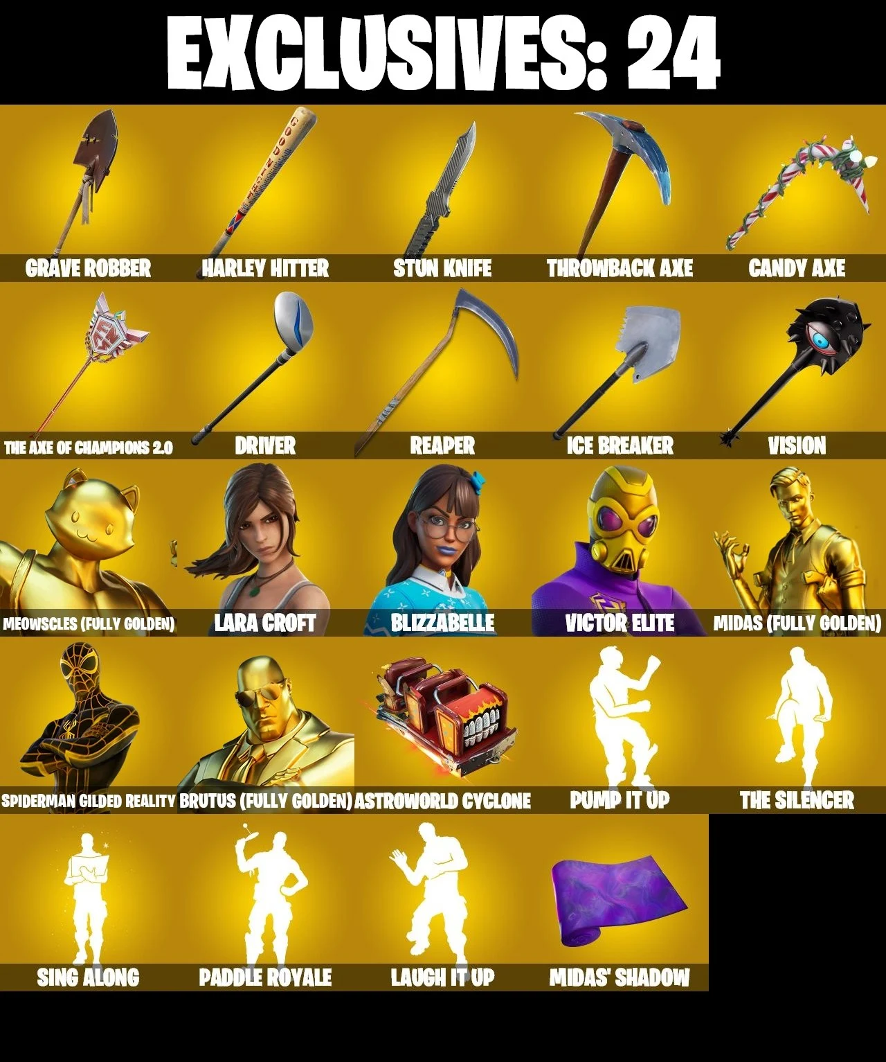 👑239 Skins 👑PC/PSN/XBOX👑 Lara Croft 👑 Laugh It Up 👑 Throwback Axe 👑 Midas (Fully Golden) 👑 Victor Elite 👑 Pump It Up 👑 The Silencer 👑 Paddle Royale 👑 Sing Along👑