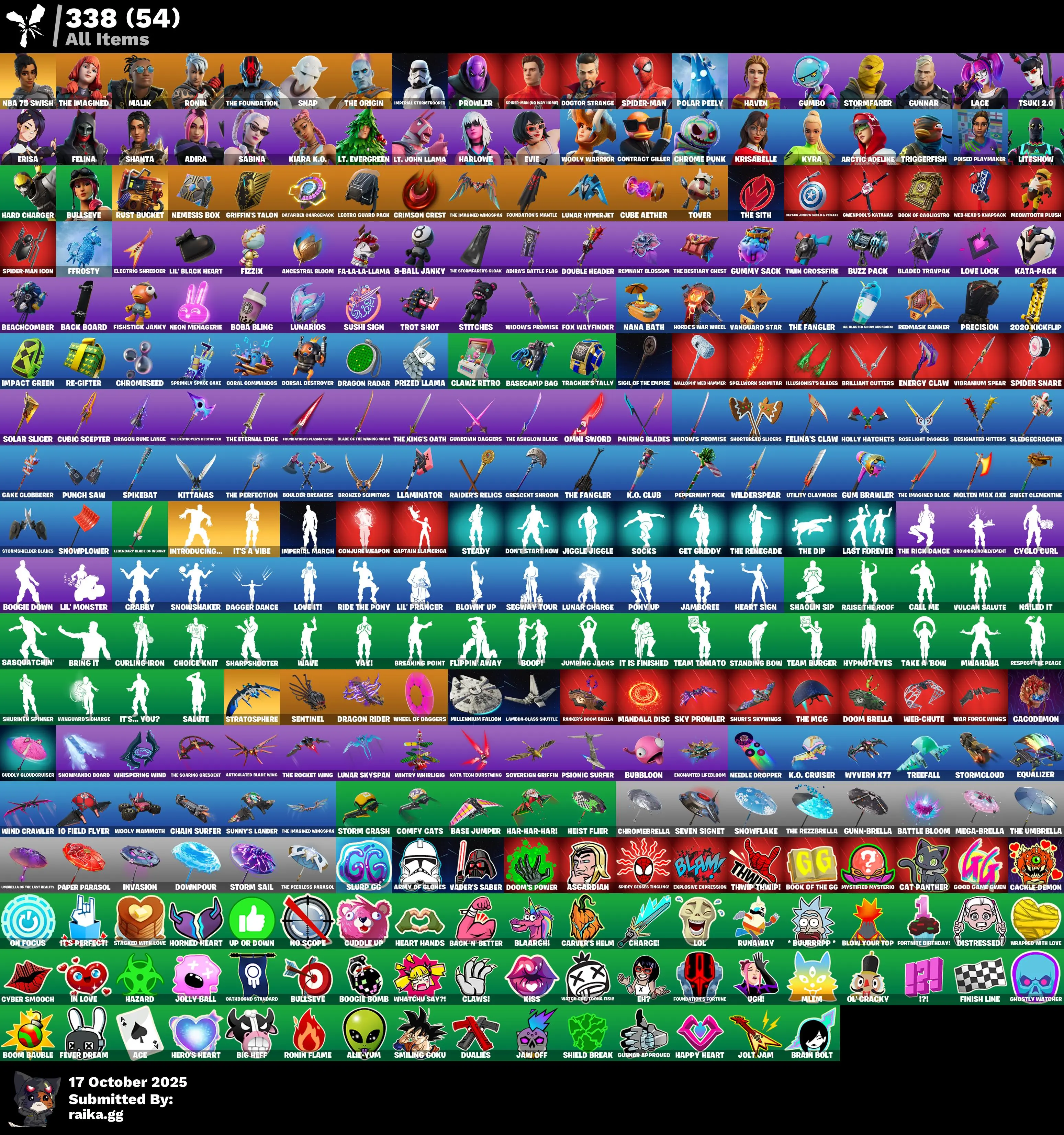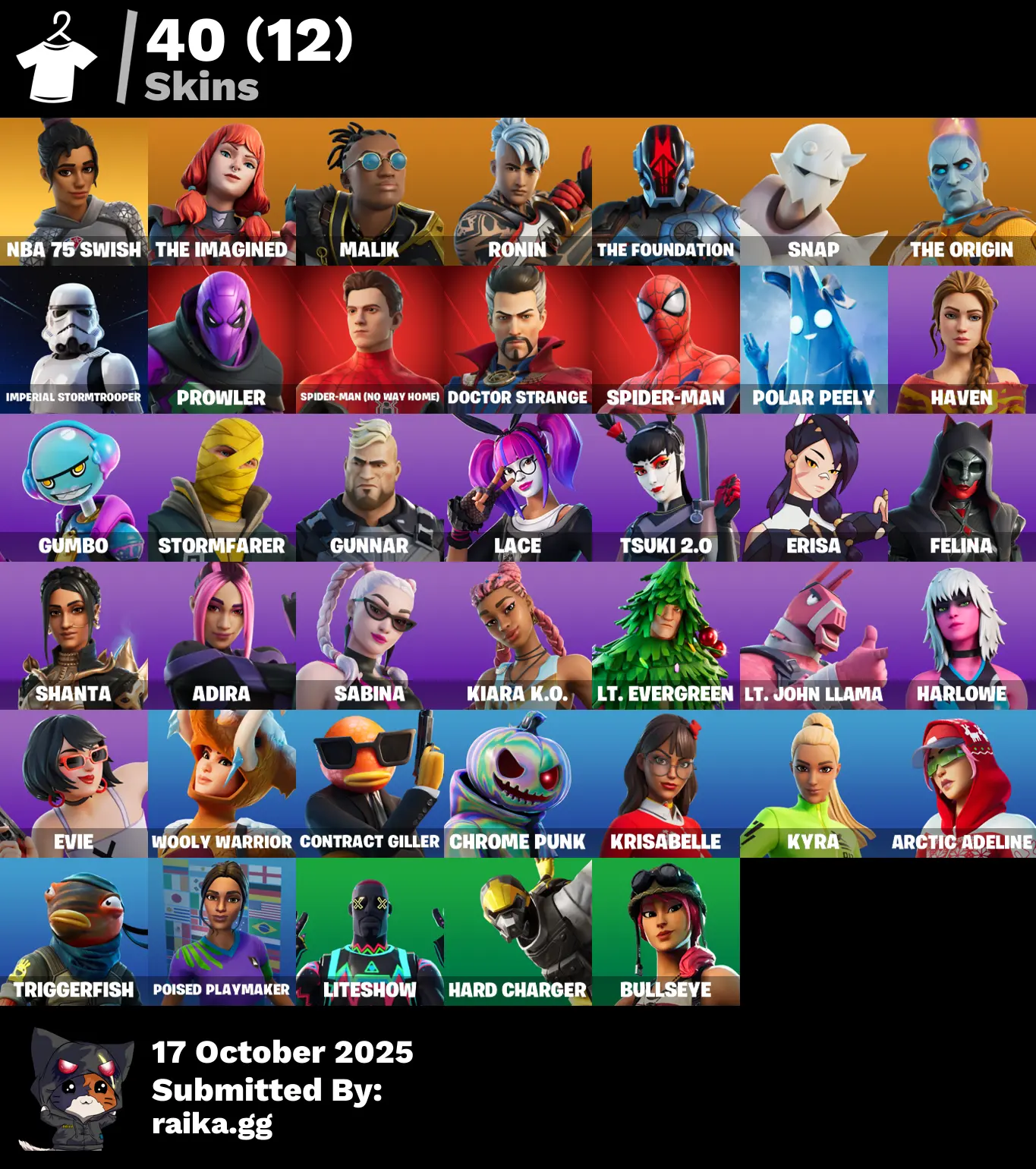40 skins | The Foundation🐔Adira🐔Shanta🐔Prowler🐔Gumbo🐔Lace🐔Felina🐔Imperial Stormtrooper🐔The Imagined🐔Tsuki 2.0🐔Malik🐔Erisa🐔Gunnar🐔Doctor Strange🐔NBA 75 Swish🐔Spider-Man🐔Haven🐔Polar Peely🐔Stormfarer🐔Ronin🐔Snap🐔The Origin D5138