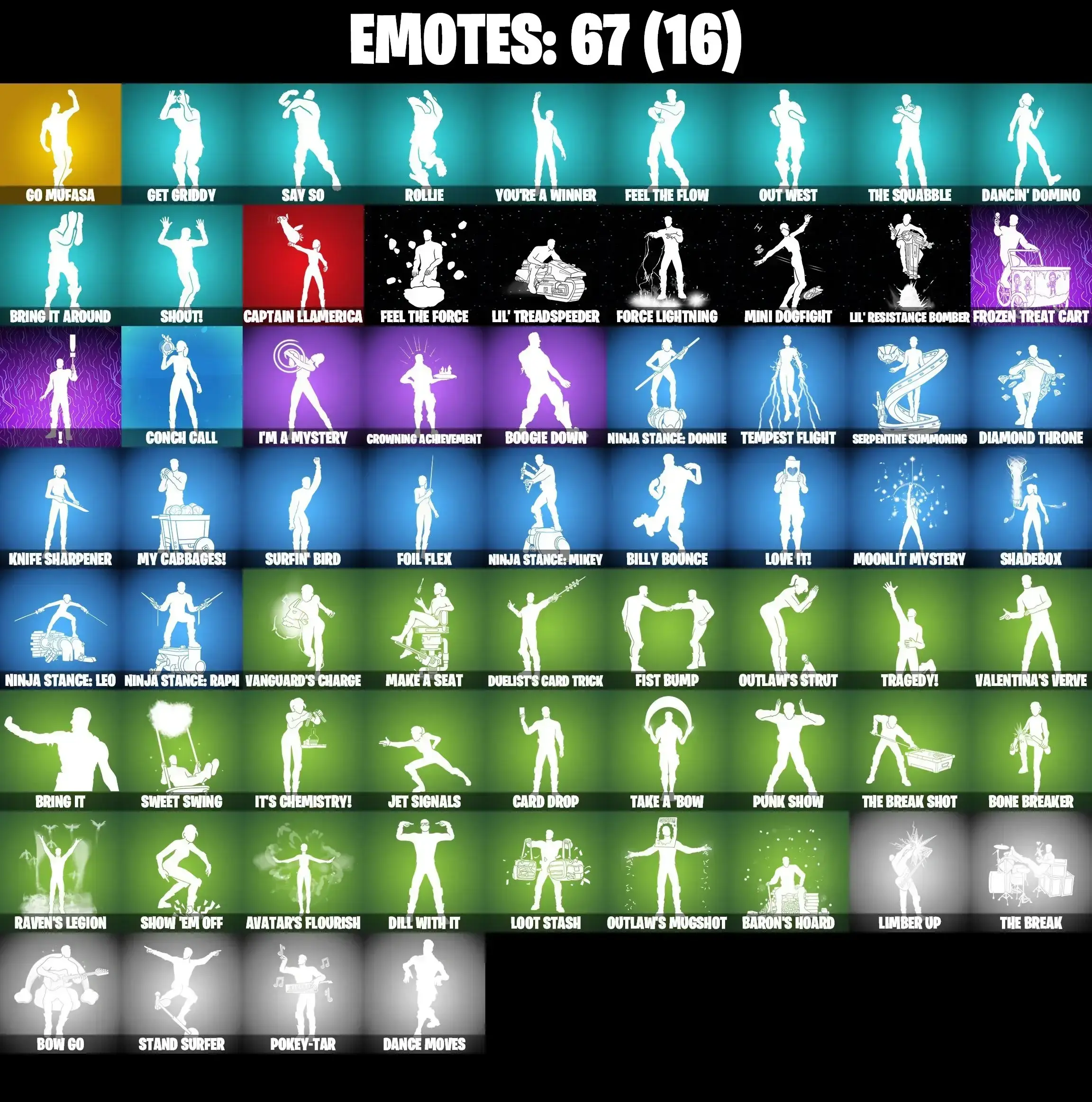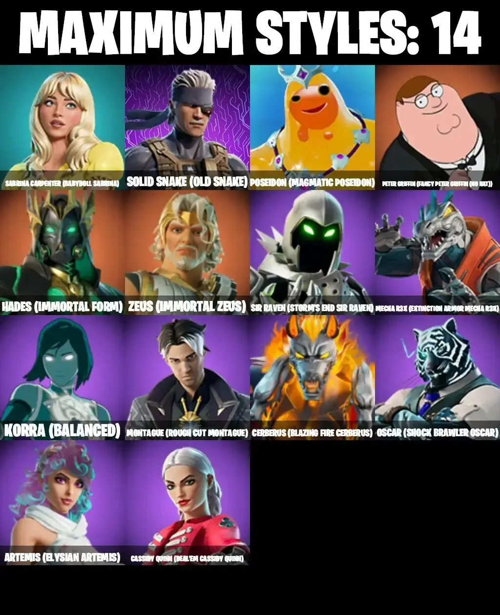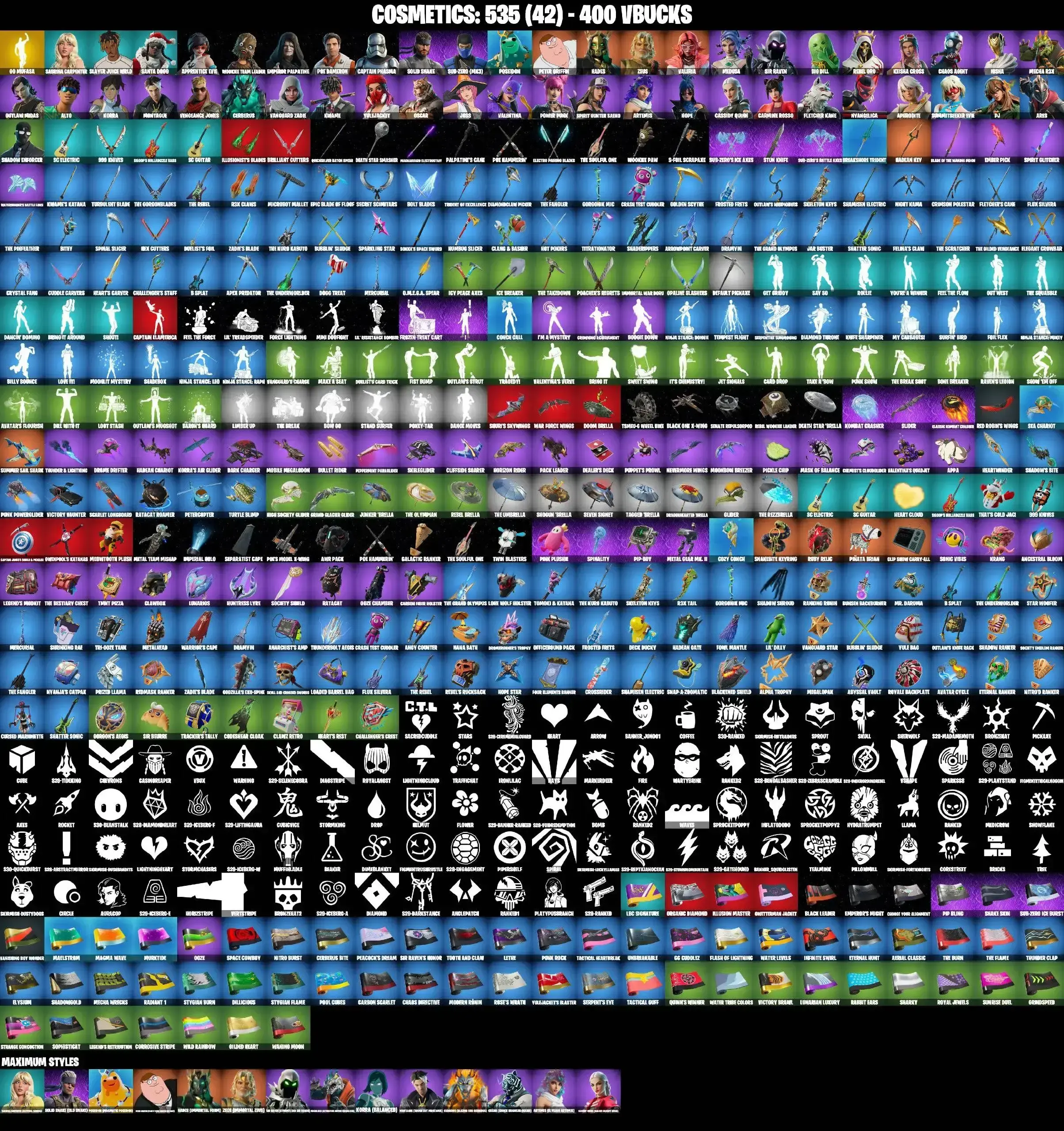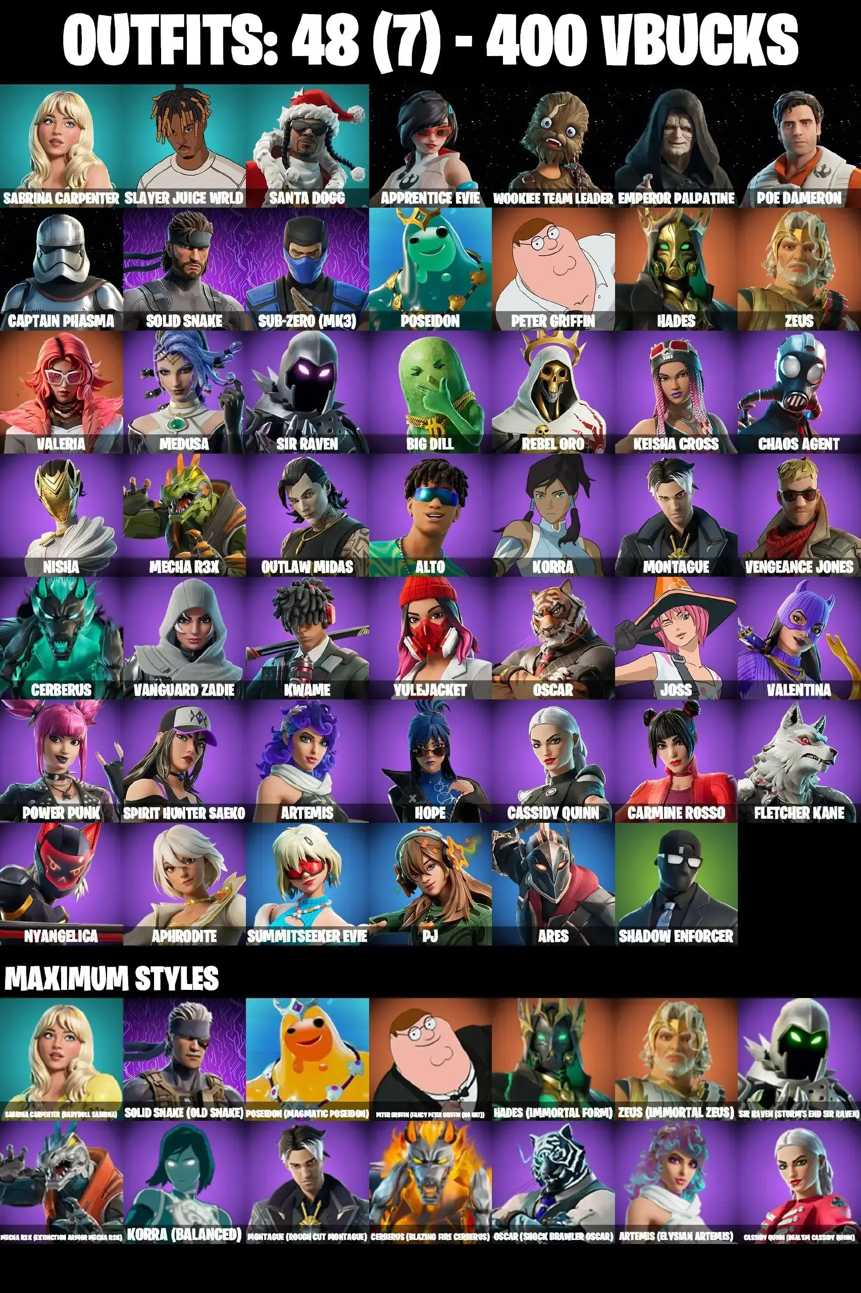 48 SKINS | GO MUFASA | SUB-ZERO MK3 | CAPTAIN PHASMA | GET GRIDDY | APPRENTICE EVIE | WOOKIE TEAM LEADER | EMPEROR PALPATINE | POE DAMERON | OUTLAW MIDAS | ARTEMIS MAX | SPIRIT HUNTER SAEKO | SUMMITSEEKER EVIE | ARES | VALENTINA |