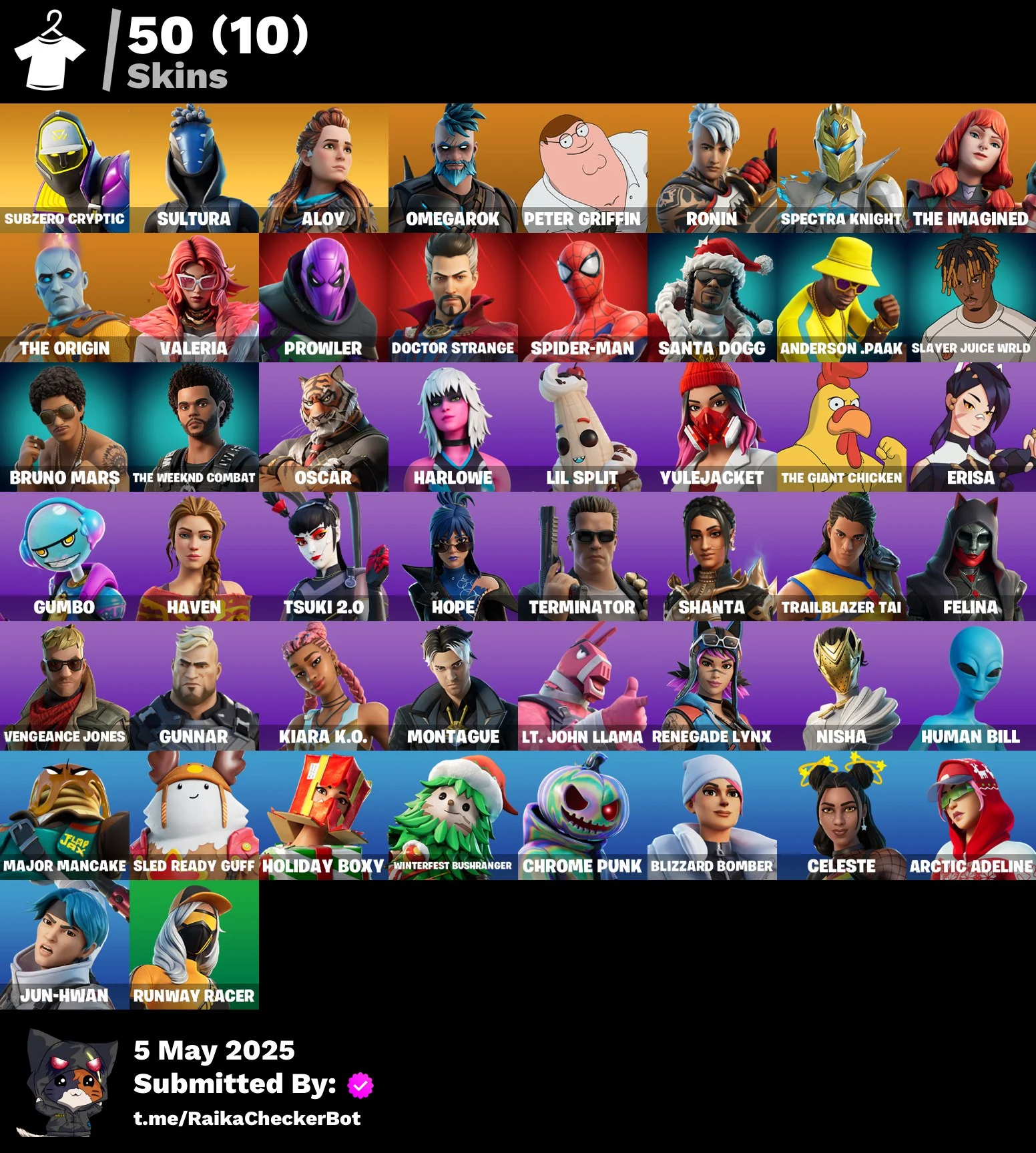 50 skins | Subzero Cryptic | Sultura | Aloy | Omegarok | Peter Griffin | Ronin | Spectra Knight | The Imagined | The Origin | Valeria | Prowler | 600 VB | PSP27