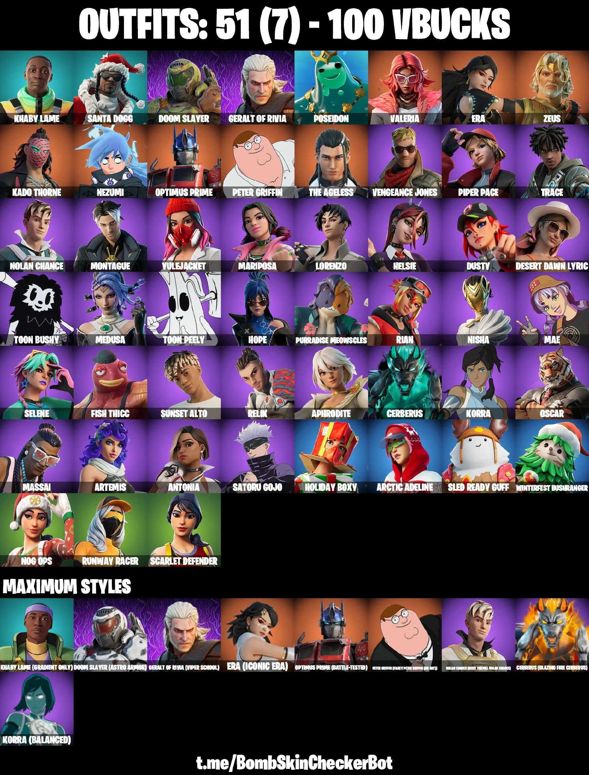 🔮51 Skins🔮 Khaby Lame💎Doom Slayer💎Geralt Of Rivia💎Arctic Adeline💎Sled Ready Guff💎Holiday Boxy💎Winterfest Bushranger