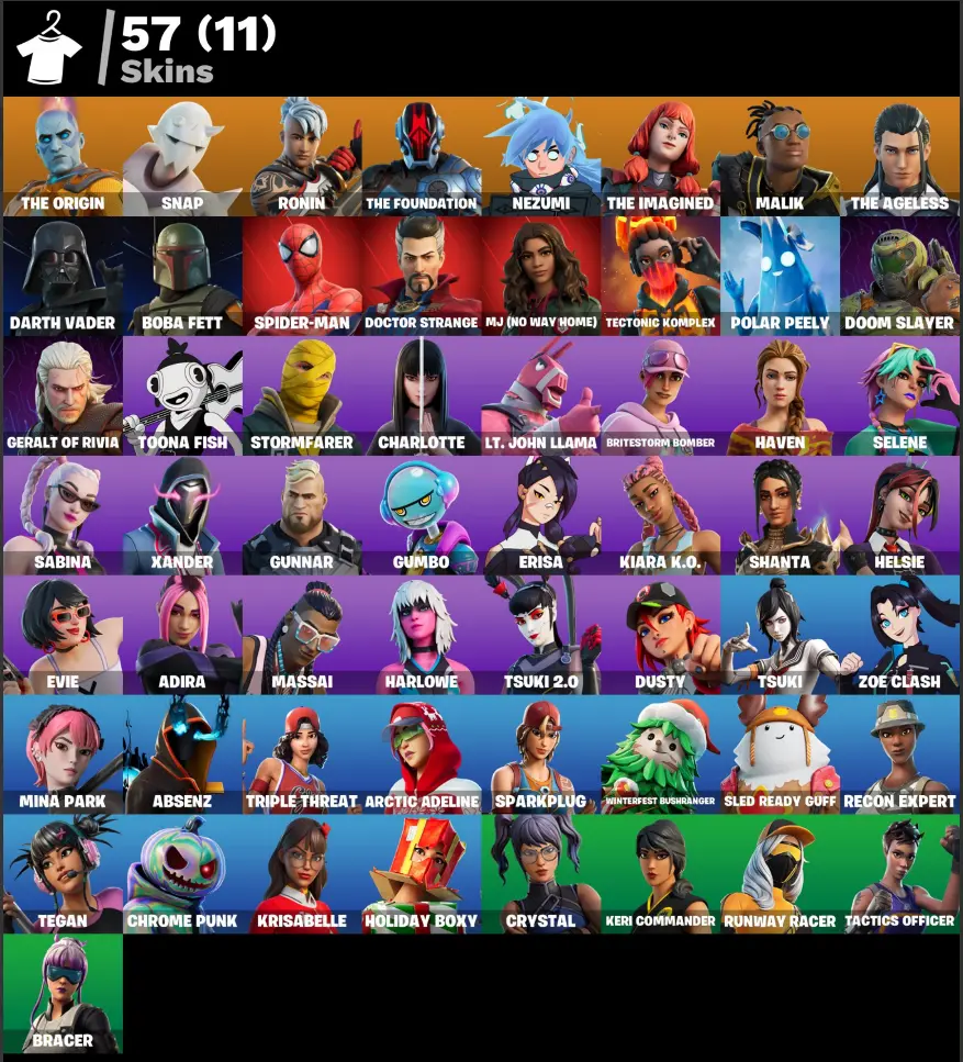 57 SKINS ⸱ For all platforms, 3050 VB, Candy Axe | The Origin | Snap | Ronin | The Foundation | Nezumi | The Imagined | Malik | The Ageless | Darth Vader | Boba Fett