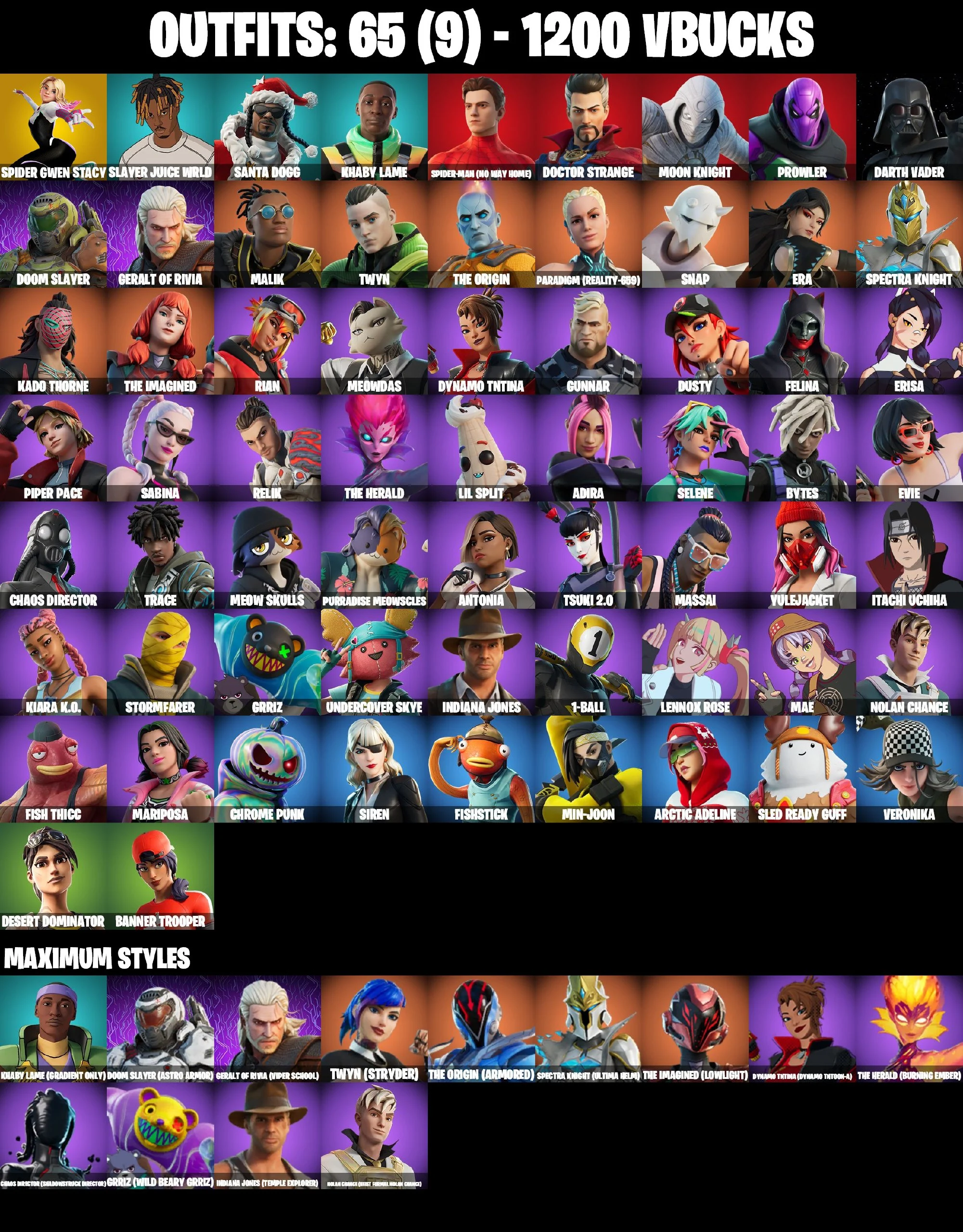 65 SKINS | SPIDER-GWEN | SLAYER JUICE WRLD | SANTA DOGG | KHABY LAME | SPIDER-MAN (NO WAY HOME) | DOCTOR STRANGE | MOON KNIGHT | PROWLER | DARTH VADER | DOOM SLAYER | GERALT OF RIVIA | MALIK | TWYN |