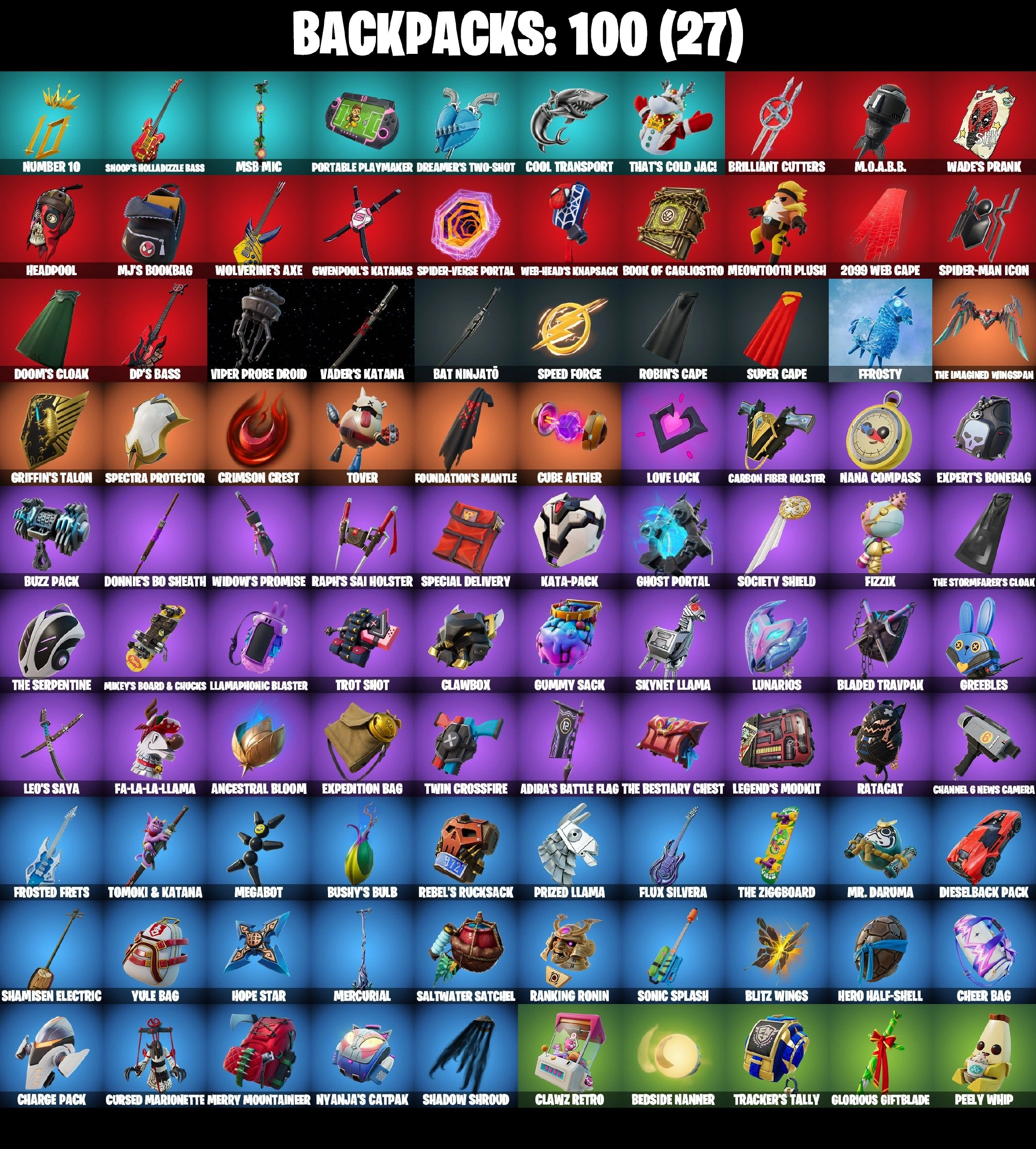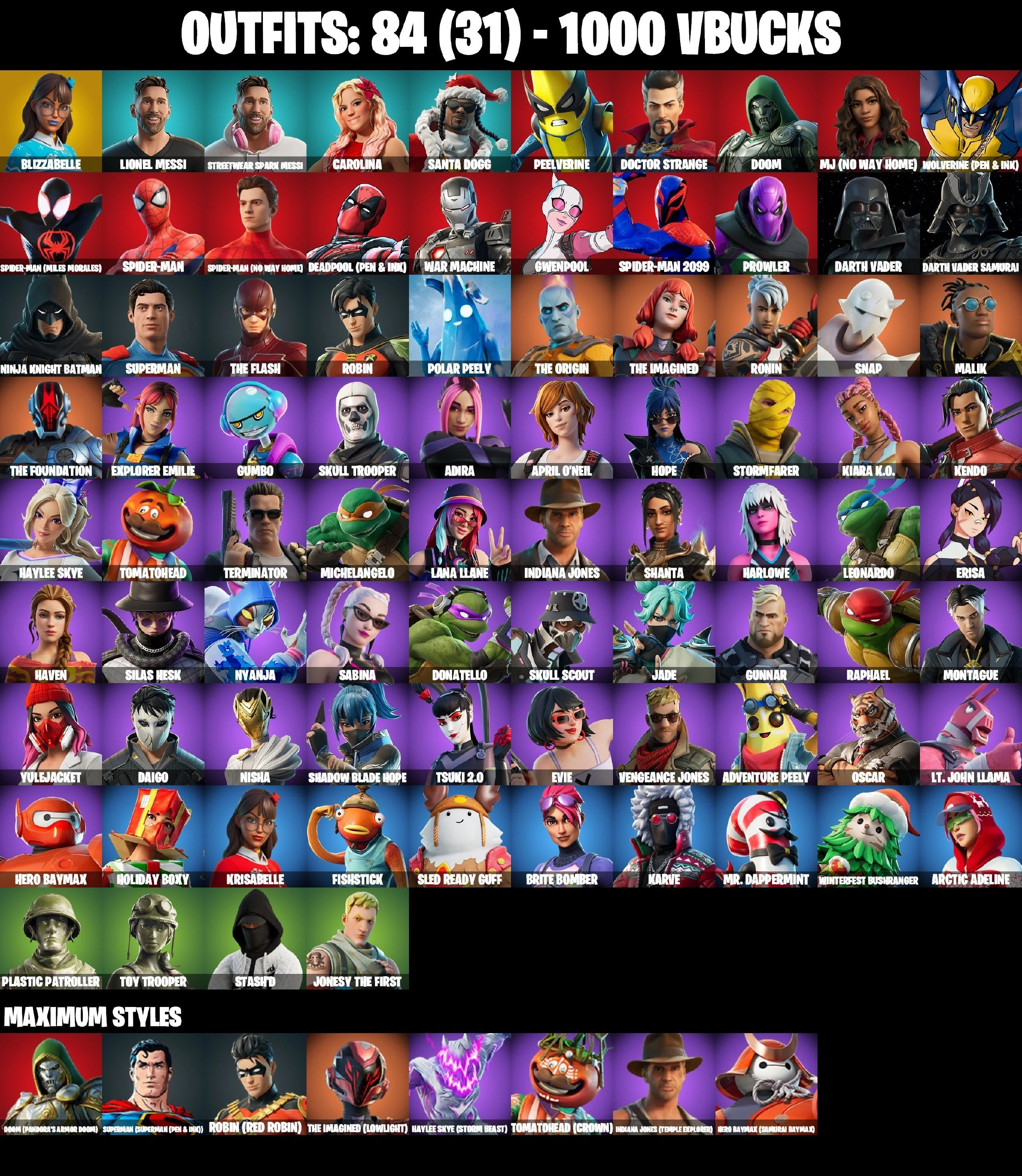 84 SKINS ⸱ CAROLINA ⸱ LIONEL MESSI ⸱ TERMINATOR ⸱ TMNT BUNDLE ( LEONARDO ⸱ RAPHAEL ⸱ DONATELLO ⸱ MICHELANGELO) ⸱ APRIL O'NEIL ⸱ SKULL TROOPER ⸱ ROBIN ⸱ MJ ⸱ DEADPOOL ⸱ GWENPOOL ⸱ DARTH VADER ⸱ ADVENTURE PEELY ⸱ SUPERMAN ⸱ SPIDER-M