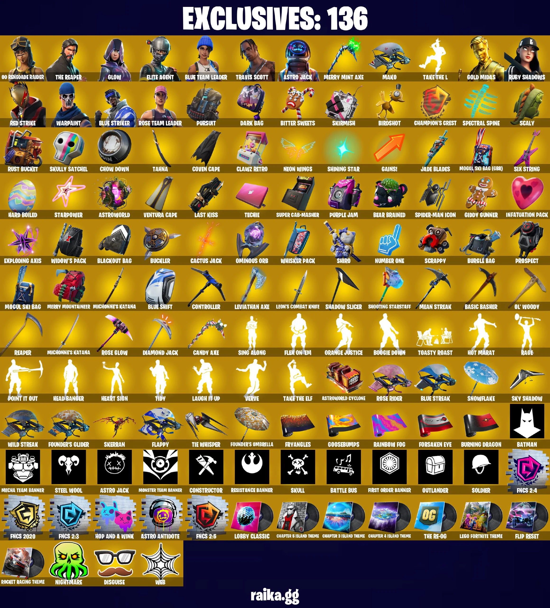 ๐ฅ๐งจ EXCLUSIVE ACCOUNT ๐งจ๐ฅ 207 skins ๐ OG Renegade Raider (OG STYLE) ๐ Travis Scott ๐ Merry Mint Axe ๐ OG STW ๐ The Reaper ๐ Glow ๐ Elite Agent ๐ Blue Team Leader ๐ Astro Jack ๐ Mako ๐ Take The L ๐ Gold Midas ๐ Blue Striker ๐ PC\PSN\XBOX\SWITCH ๐