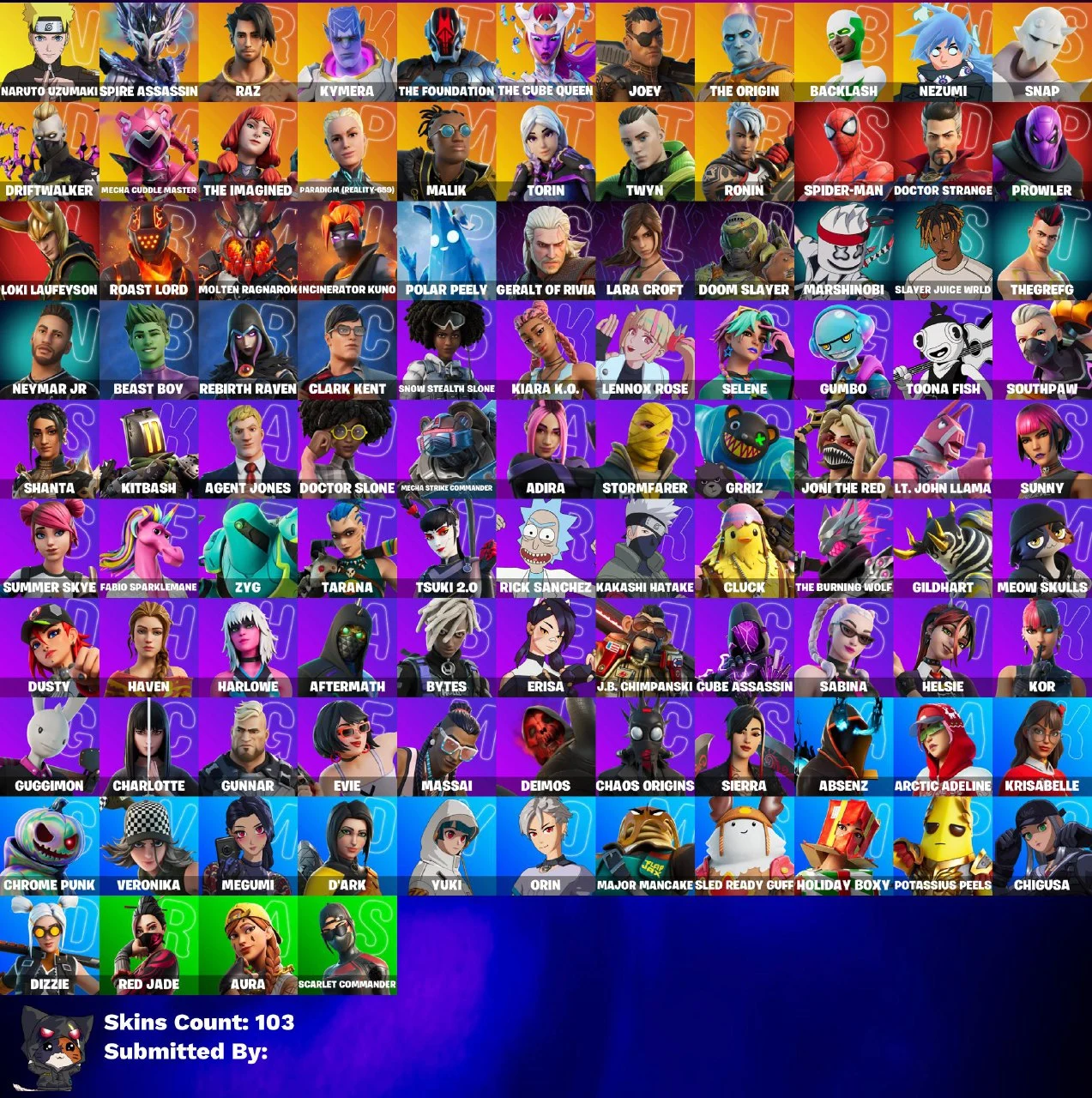 ๐ฅ๐ EXCLUSIVE OFFER ๐๐ฅ 103 SKINS ๐ NARUTO UZUMAKI ๐ SPIRE ASSASSIN ๐ RAZ ๐ KYMERA ๐ THE FOUNDATION ๐ THE CUBE QUEEN ๐ JOEY ๐ THE ORIGIN ๐ BACKLASH ๐ NEZUMI ๐ SNAP ๐ DRIFTWALKER ๐ MECHA CUDDLE MASTER ๐ THE IMAGINED ๐ 0 VB ๐ FULL ACCESS ๐