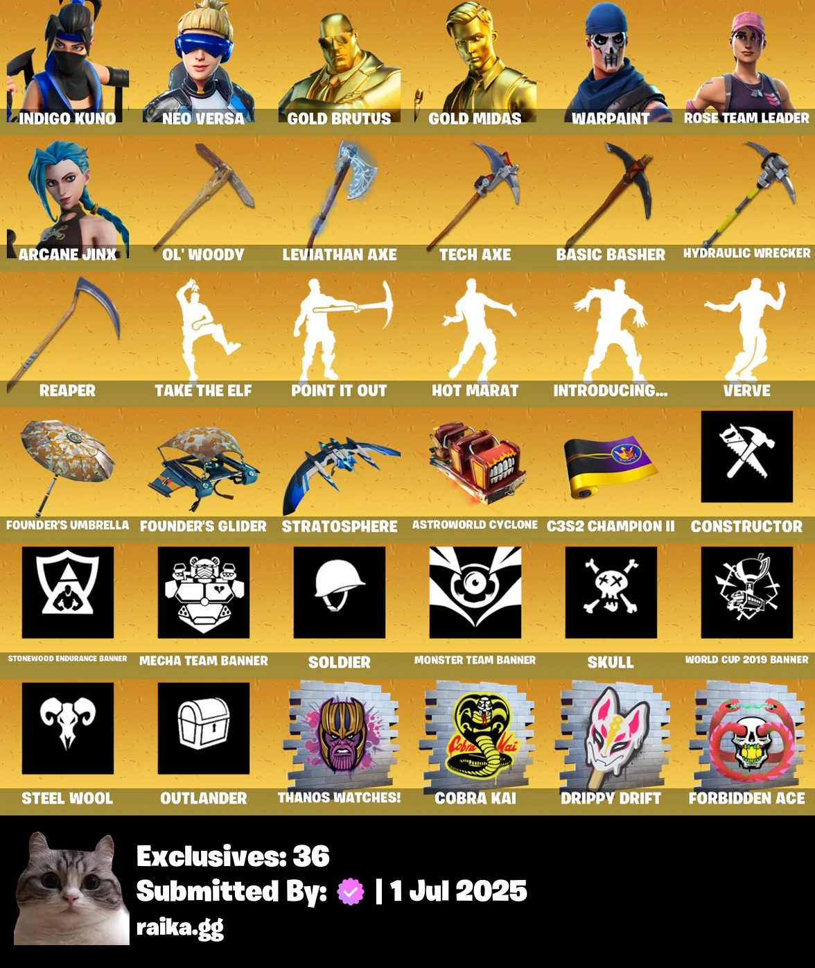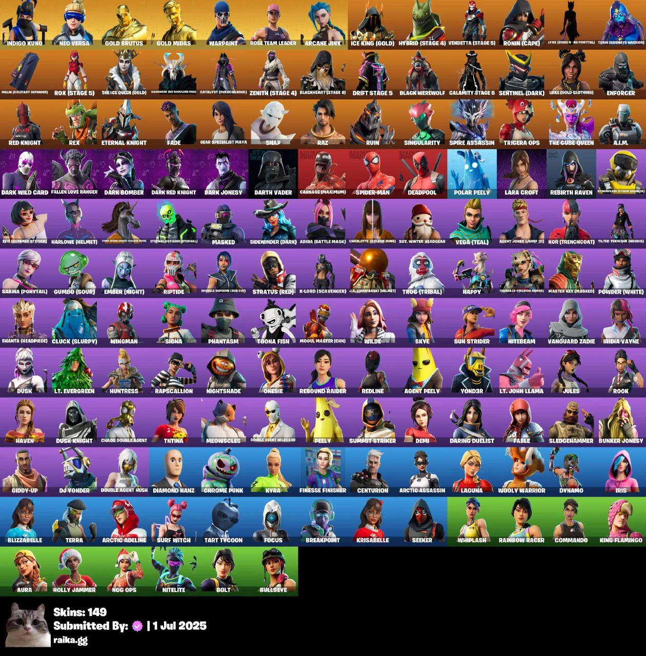 [PC] 149 skins | OG STW | Indigo Kuno | Neo Versa | Gold Brutus | Gold Midas | Arcane Jinx | Ice King (Gold) | Hybrid (Stage 4) | Vendetta (Stage 5) | 660 VB