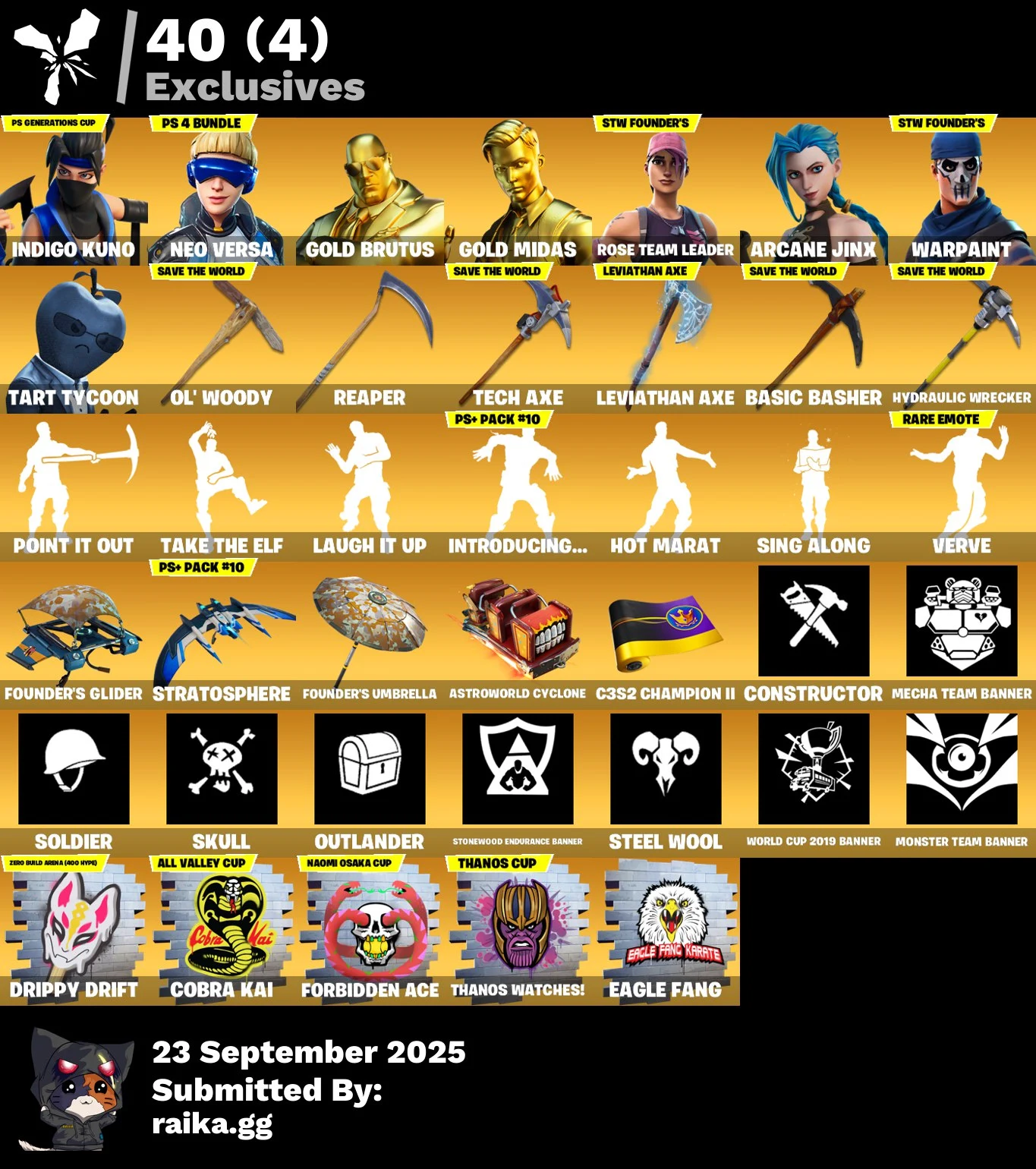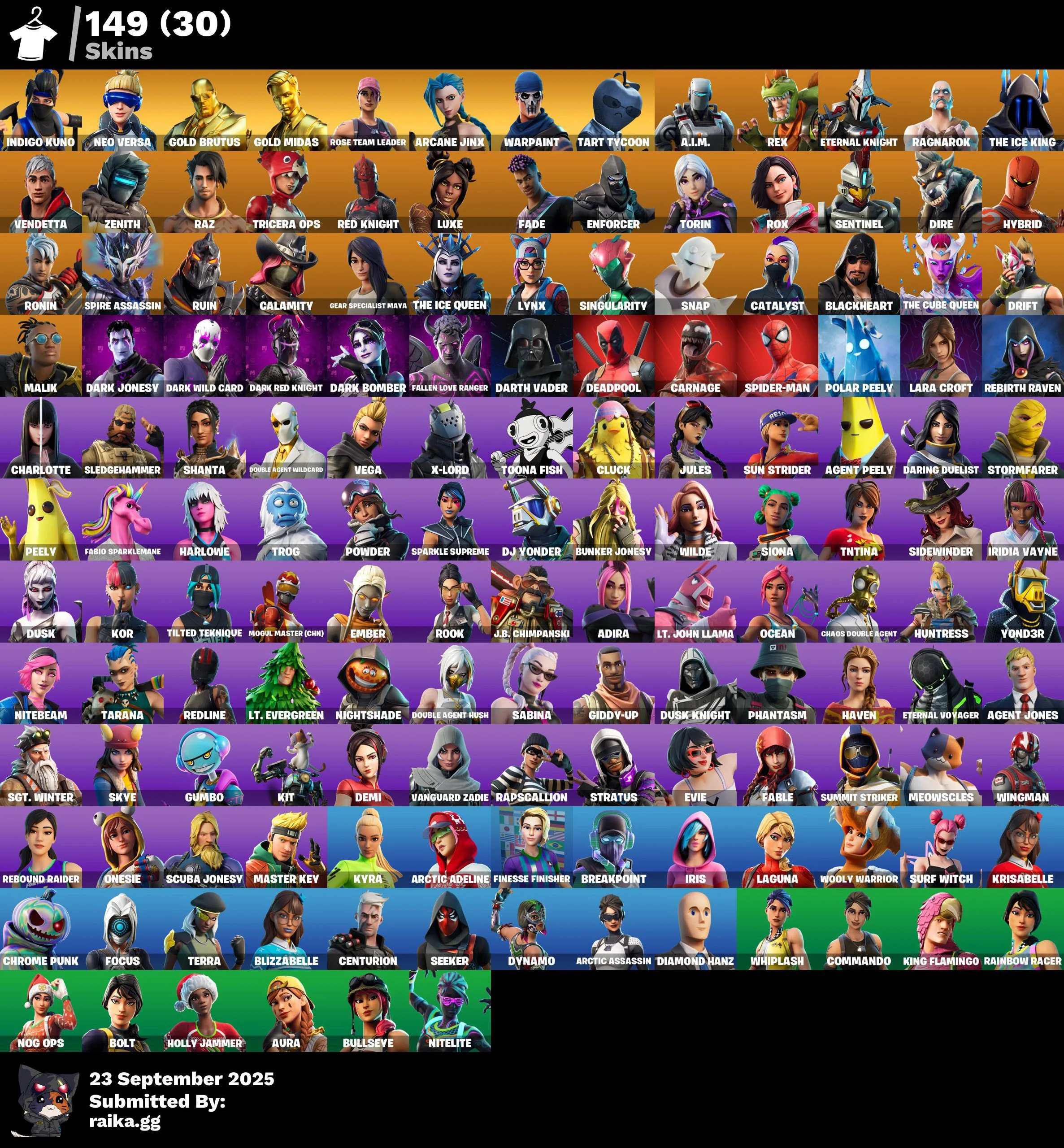 [PC] 149 skins | OG STW | Indigo Kuno | Neo Versa | Gold Brutus | Gold Midas | Arcane Jinx | Tart Tycoon | A.I.M. | Rex | Eternal Knight | Ragnarok | 660 VB