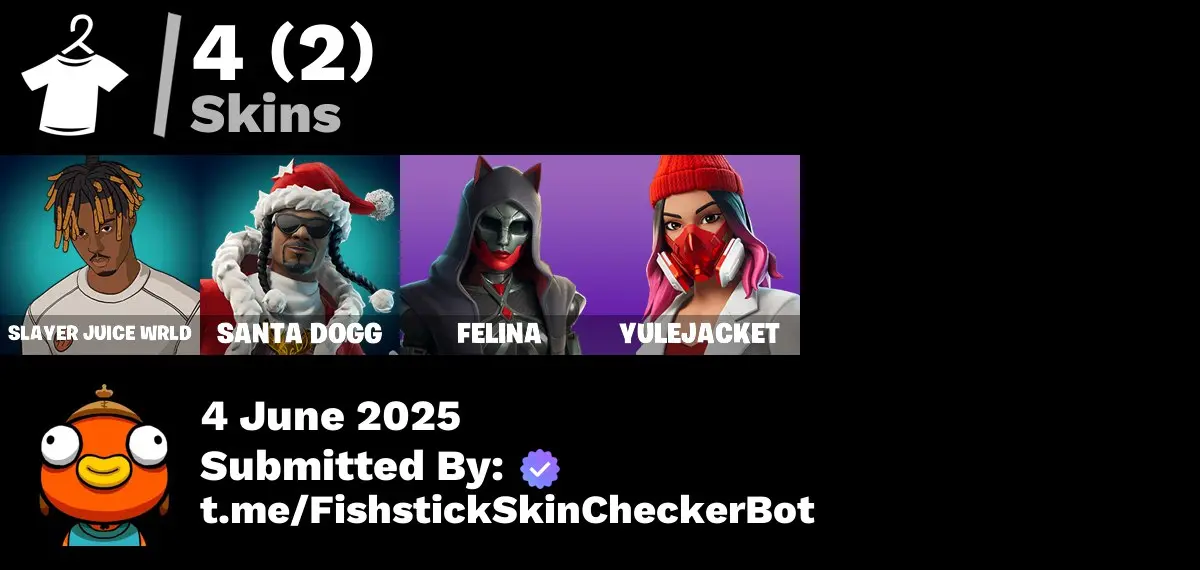 [PC] 4 Skins | Slayer Juice WRLD | Santa Dogg | Felina | Yulejacket | Meowtooth Plush | Gwenpool's Katanas | Captain Jones's Shield & Pickaxe | FN39