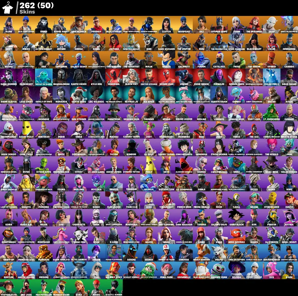 (PC PSN XBOX) 262 SKINS / MERRY MINT AXE / FA / ITACHI UCHIHA / TAKE THE L / HINATA HYUGA / LARA CROFT / CLOAKED SHADOW / SPIDER-GWEN / OG STW | Glow | Blue Team Leader | Grind | Rogue Agent