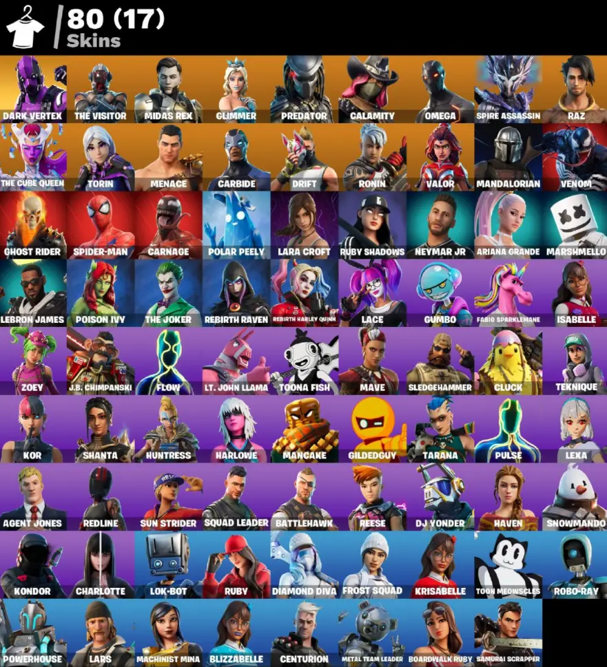 (PC PSN XBOX) 80 skins | Dark Vertex | Drift | Ronin | The Cube Queen | Raz | Midas Rex | Spire Assassin | Predator | Menace | Calamity | Valor | 1150 VB / THE JOKER / LARA CROFT / MARSHMELLO / REBIRTH HARLEY QUINN