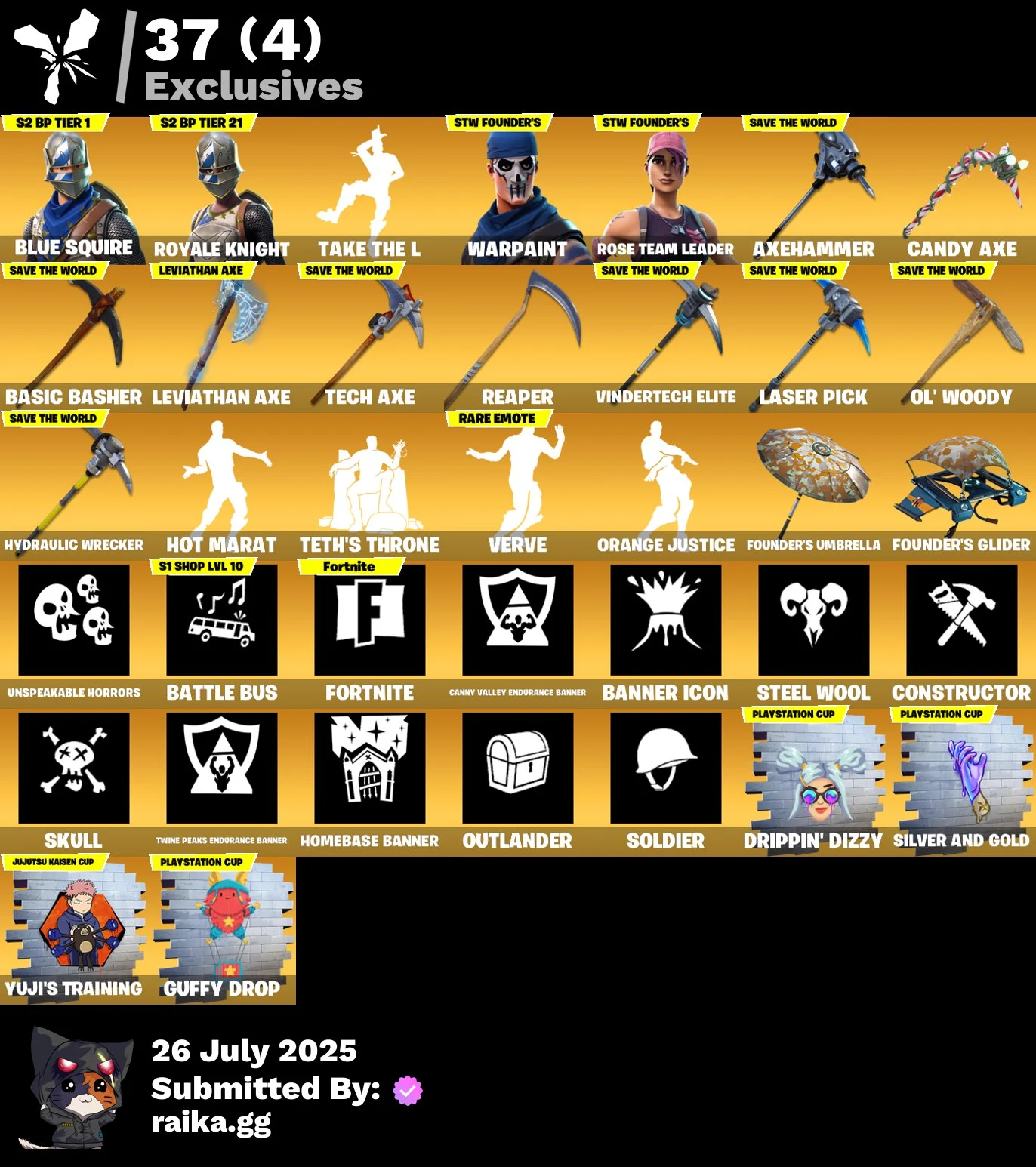 [PC/PS/XBOX] 190 Skins ✔ OG STW ✔ Blue Squire ✔ Royale Knight ✔ Take The L ✔ Axehammer ✔ Candy Axe ✔ Basic Basher ✔ 180 VB