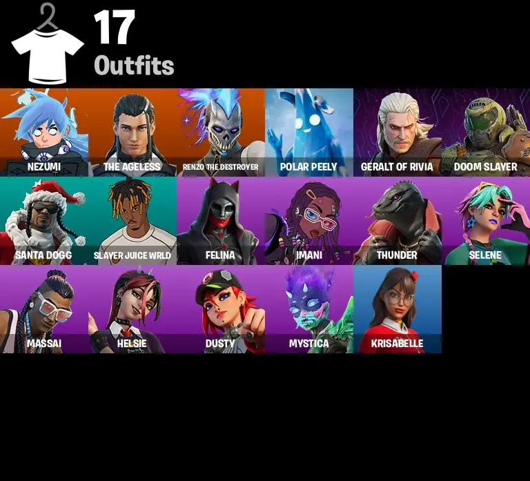 【PC/NS/XBOX/ 17 SKINS 🔥 NEZUMI 🔥 THE AGELESS 🔥 RENZO THE DESTROYER 🔥 POLAR PEELY 🔥 DOOM SLAYER 🔥 GERALT OF RIVIA 🔥 SLAYER JUICE WRLD 🔥 0 VB