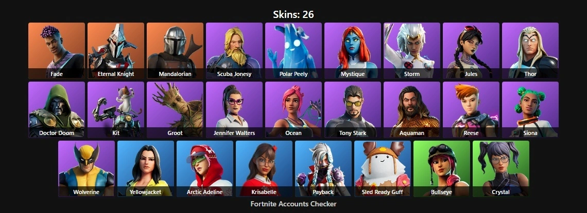 PC/PSN 26 Skins⚡ | Fade | Eternal Knight | Mandalorian | Scuba Jonesy | Polar Peely | Mystique | Storm | Jules | Thor | Doctor Doom | Kit | Groot