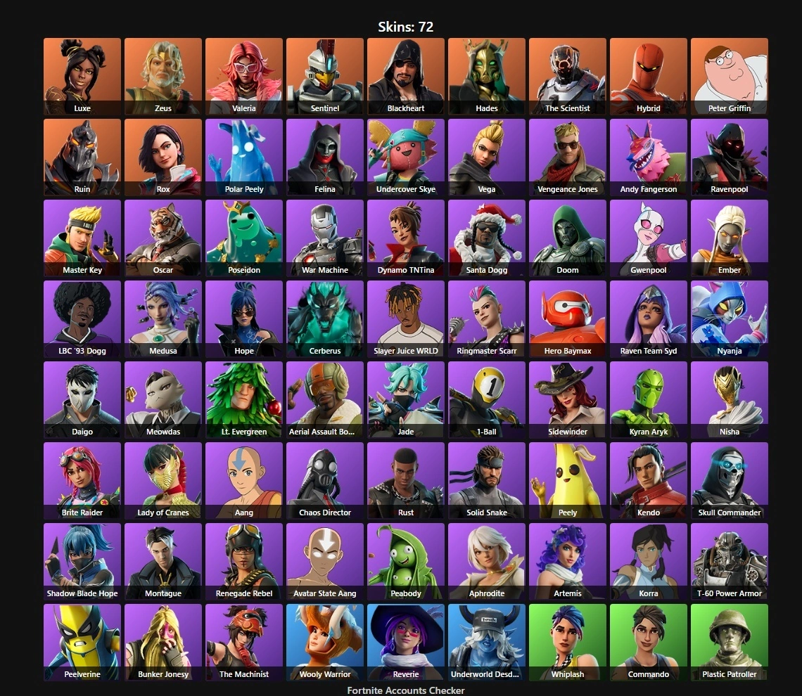 PC/PSN 72 Skins⚡ | Peely | Luxe | Zeus | Valeria | Sentinel | Blackheart | Hades | The Scientist | Hybrid | Peter Griffin | Ruin | Rox | Polar Peely | Felina