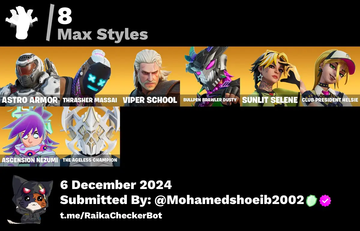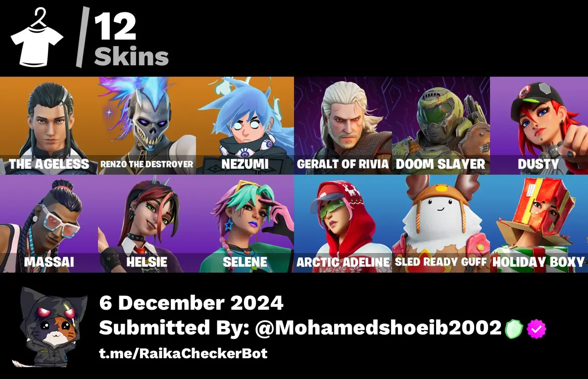 [PC/PSN/XBOX] 12 skins | The Ageless | Renzo the Destroyer | Nezumi | Geralt of Rivia | Doom Slayer | Dusty | Massai | Helsie | Selene | 200 VB