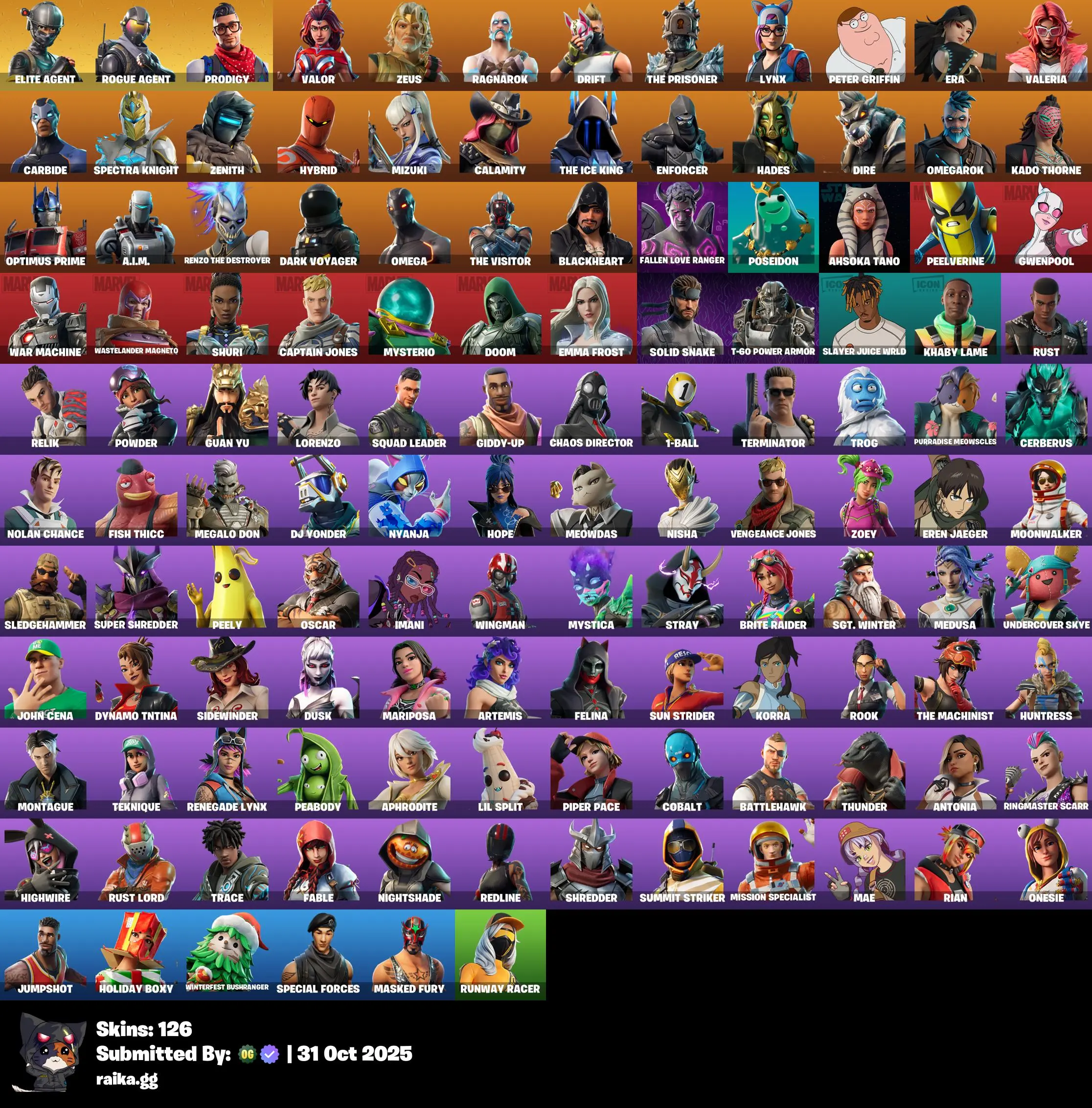 [PC/PSN/XBOX] 126 skins | Elite Agent | Rogue Agent | Prodigy | Valor | Zeus | Ragnarok | Drift | The Prisoner | Lynx | Peter Griffin | Era | Valeria | 1100 VBUCKS