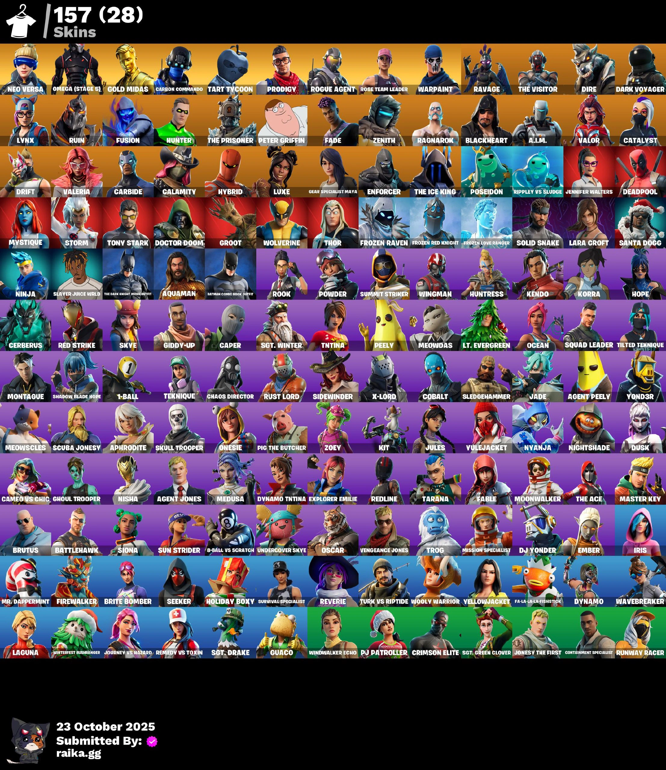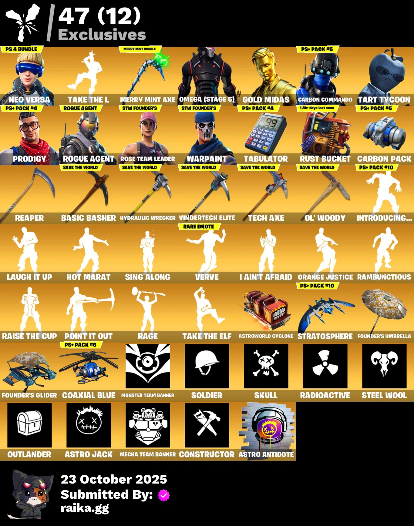 [PC/PSN/XBOX] 157 skins | OG STW | Mery Minty Axe | Neo Versa | Omega (stage 5) | Gold Midas | Carbon Commando | Tart Tycoon | Prodigy | Rogue Agent | Ravage | The Visitor | 350 VB
