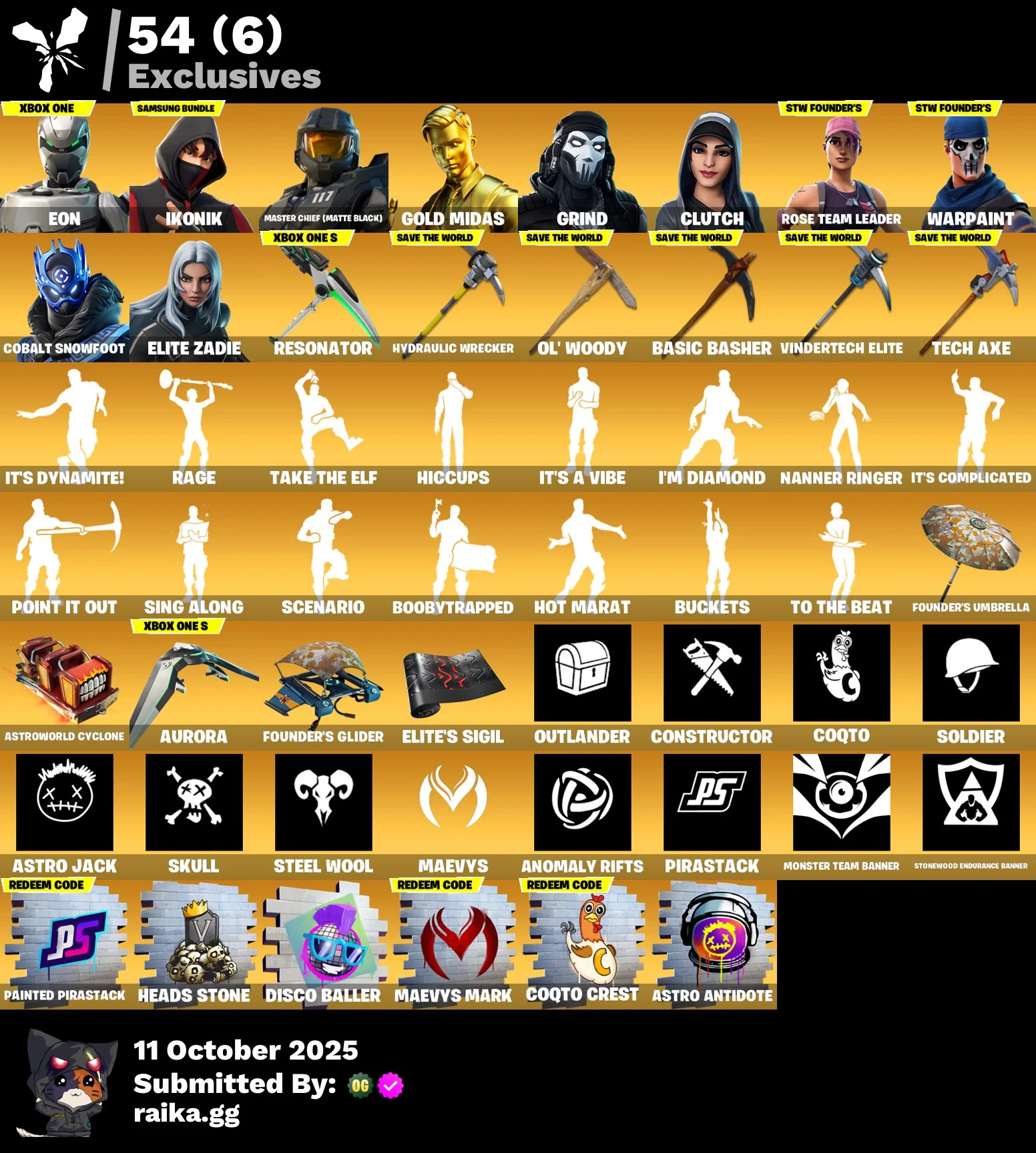 [PC/PSN/XBOX] 262 skins | OG STW | Aerial Assault Trooper | Eon | IKONIK | Master Chief (Matte Black) | Gold Midas | Grind | Clutch | Cobalt Snowfoot | 200 VB