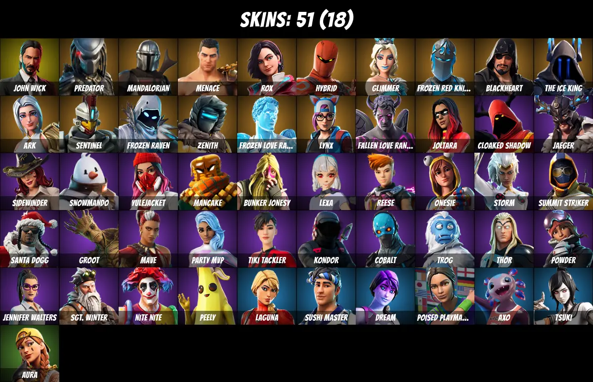 ⚡PC/PSN/XBOX⚡ 51 skins 💎 Leviathan Axe 💎 John Wick 💎 Joltara 💎 Mandalorian 💎 Lynx 💎 Aura 💎 Peely 💎 Thor 💎 Hybrid 💎 Frozen Raven 💎 Zenith 💎 Frozen Red Knight 💎 Menace 💎 Glimmer 💎 Blackheart 💎 Fallen Love Ranger 💎 Rox 💎 Predator 💎 950 V-Bucks 💎