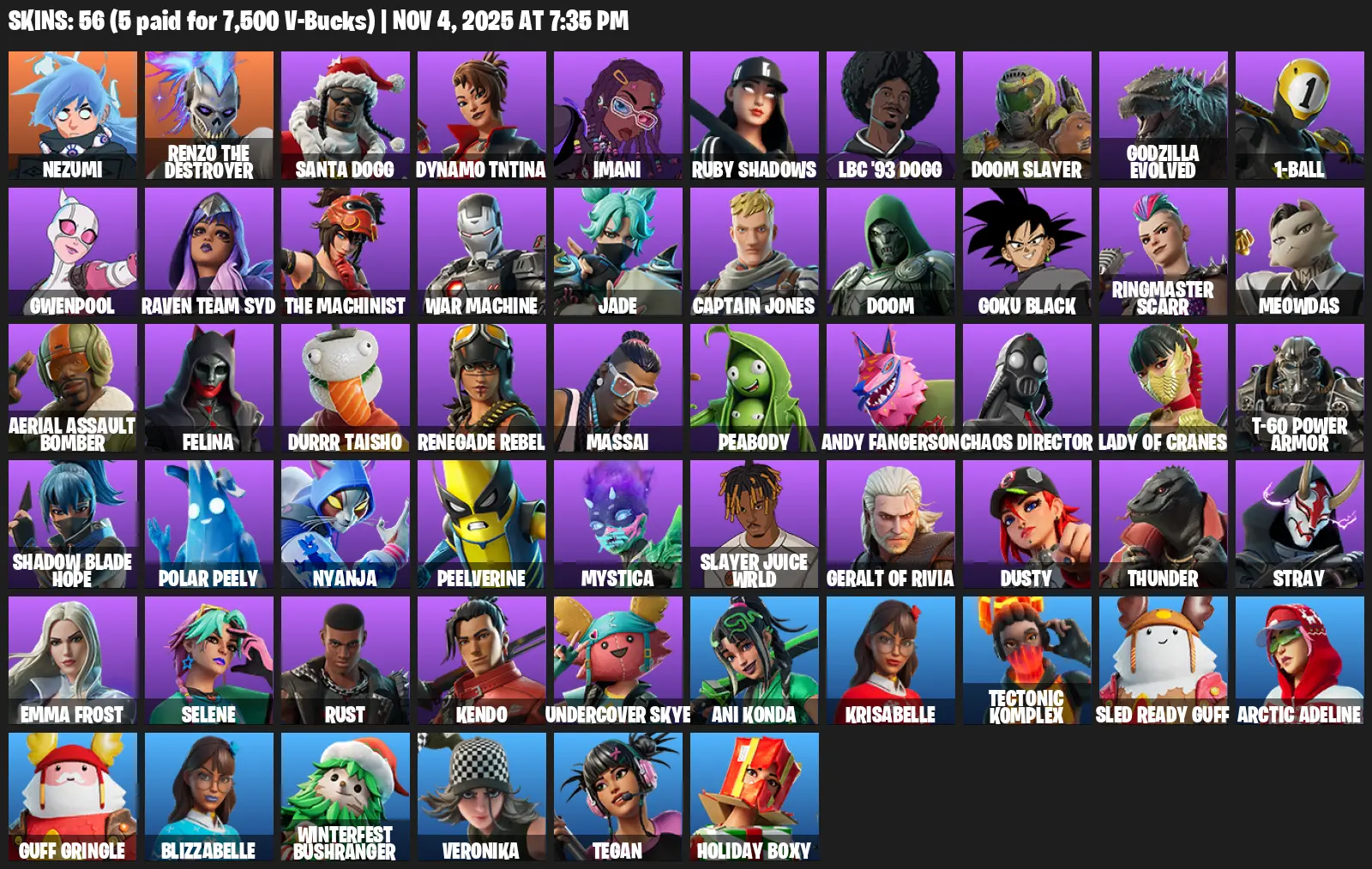 ๐จ [PC/PSN/XBOX] ๐ 56 skins | Nezumi , Renzo the Destroyer , Dynamo Tntina , Imani , Ruby Shadows , Doom Slayer , Godzilla Evolved , T-Ball , Gwenpool | ๐ 1600 VBUCKS | โ๏ธ Changeable Email Now