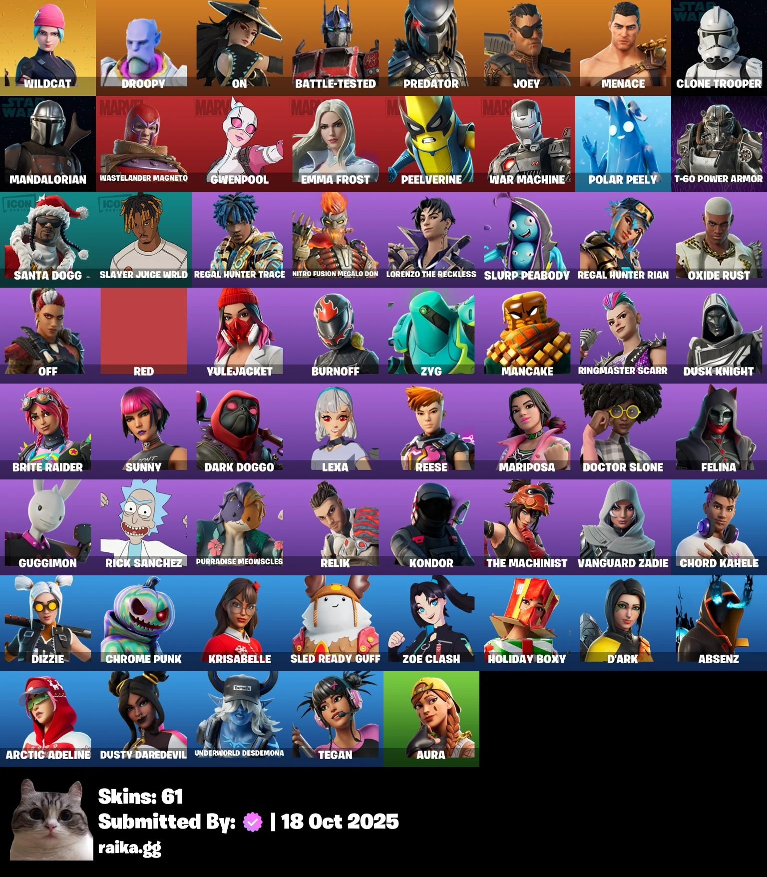 [PC/PSN/XBOX] 61 skins | Wildcat | Droopy | On | Battle-Tested | Predator | Joey | Menace | Clone Trooper | Mandalorian | Wastelander Magneto | Gwenpo