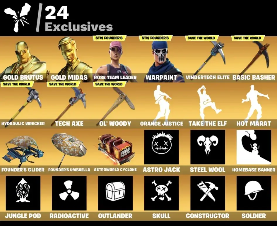 [PC/PSN/XBOX] 🎮 74 Skins | OG STW | 🟡 Gold Brutus, 🟡 Gold Midas | 🤖 Vindertech Elite | 🔨 Basic Basher, 🛠 Hydraulic Wrecker, 🪓 Tech Axe | 🌲 Ol' Woody | 💃 Orange Justice | 💸 805 V‑Bucks
