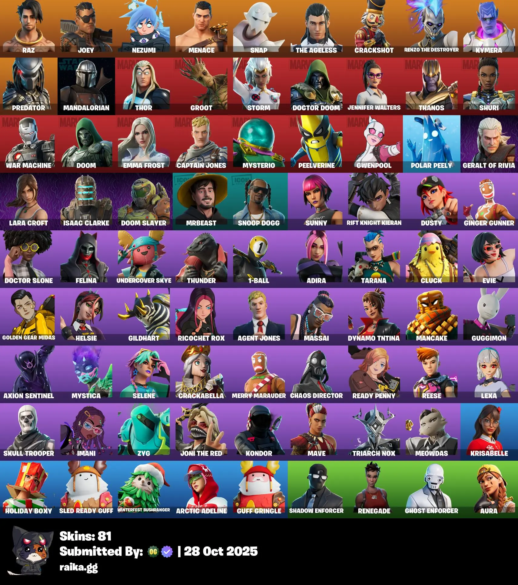 [PC/PSN/XBOX] 81 skins | Raz | Joey | Nezumi | Menace | Snap | The Ageless | Crackshot | Renzo the Destroyer | Kymera | Predator | Mandalorian | Thor | Groot | 200 VB